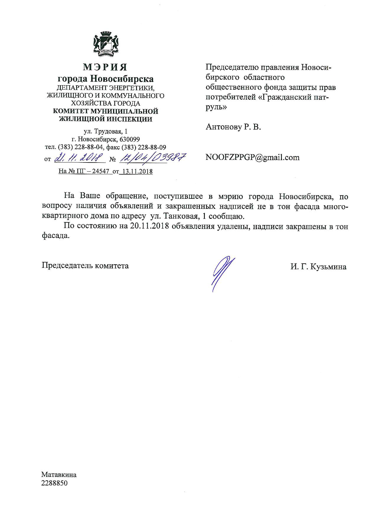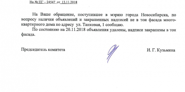 Номер жалобы:44949 Тип жалобы:Иные проблемы ЖКХ Название объекта:Управляющая Компания Регион:Новосибирская область Город:Новосибирск Адрес:ул Танковая, 1 Описание жалобы:объявления на фасаде дома Статус: