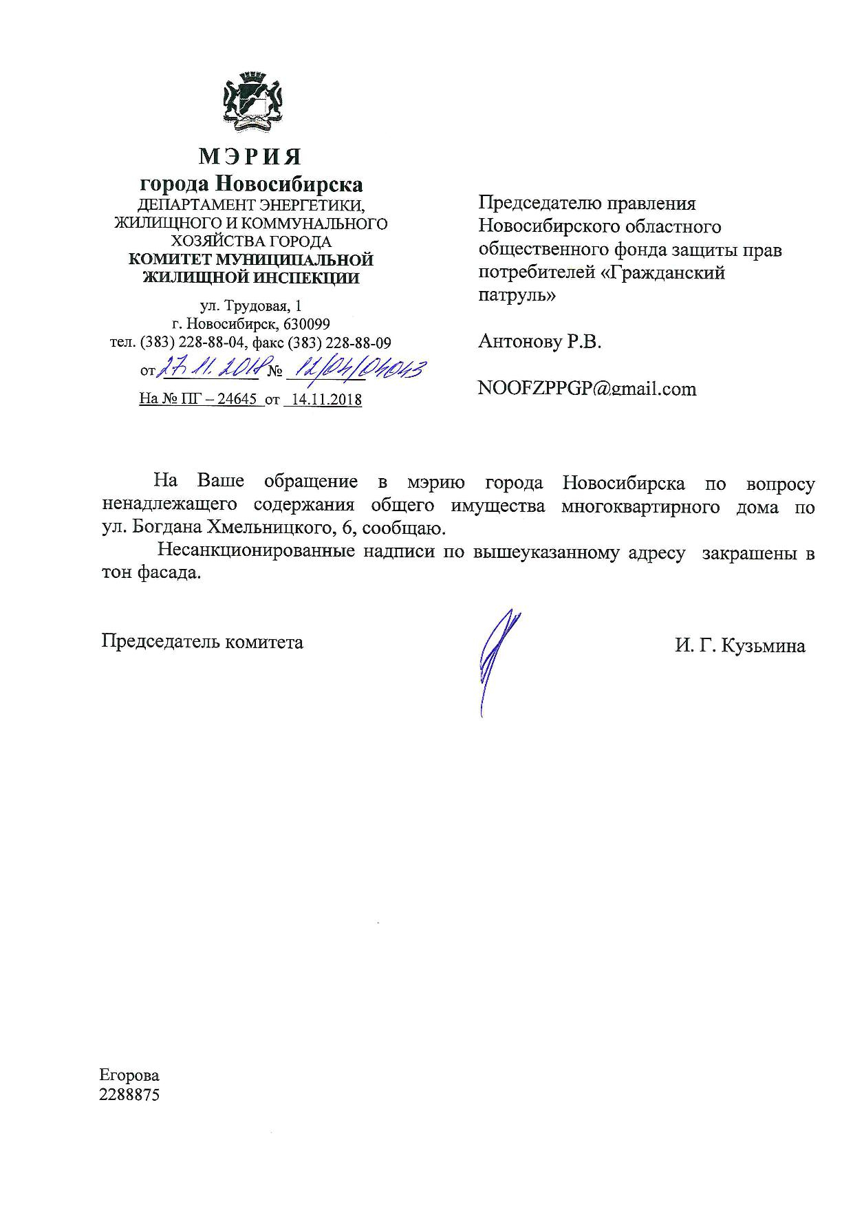 Номер жалобы:44961 Тип жалобы:Иные проблемы ЖКХ Название объекта:Управляющая Компания Адрес:(55.047412585841975, 82.91852194815874) Описание жалобы:Богдана Хмельницкого 8, надписи на фасаде дома Статус: