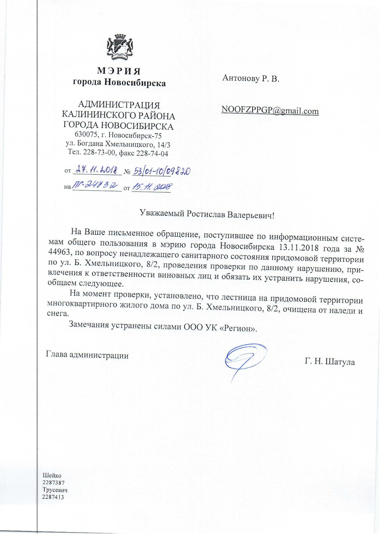 Номер жалобы:44963 Тип жалобы:Иные проблемы ЖКХ Название объекта:Управляющая Компания Регион:Новосибирская область Город:Новосибирск Адрес:ул Богдана Хмельницкого, 8/2 Описание жалобы:лестница не расчищена от снега Статус: