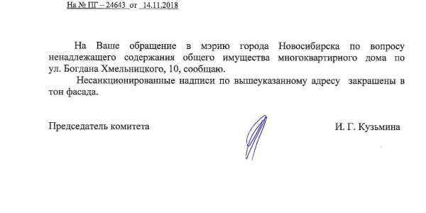 Номер жалобы:44956 Тип жалобы:Иные проблемы ЖКХ Название объекта:Управляющая Компания Регион:Новосибирская область Город:Новосибирск Адрес:ул Богдана Хмельницкого, 6 Описание жалобы:Надписи на фасаде дома закрашены не в тон Статус: