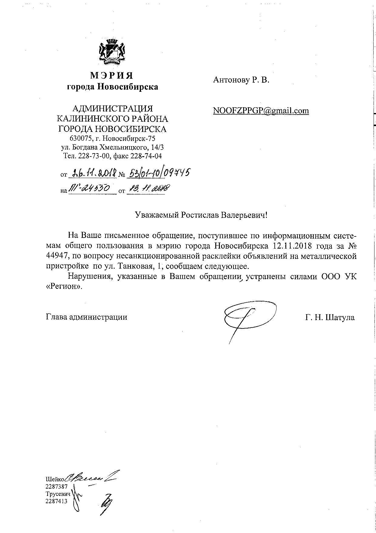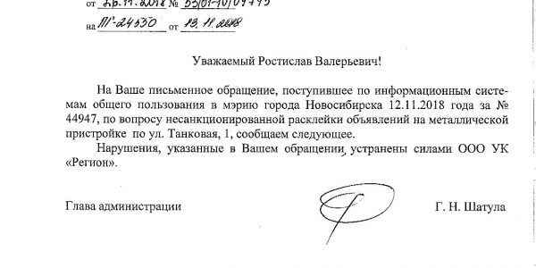 Номер жалобы:44947 Тип жалобы:Иные проблемы ЖКХ Название объекта:Управляющая Компания Регион:Новосибирская область Город:Новосибирск Адрес:ул Танковая, 1 Описание жалобы:объявления в неположенном месте Статус: