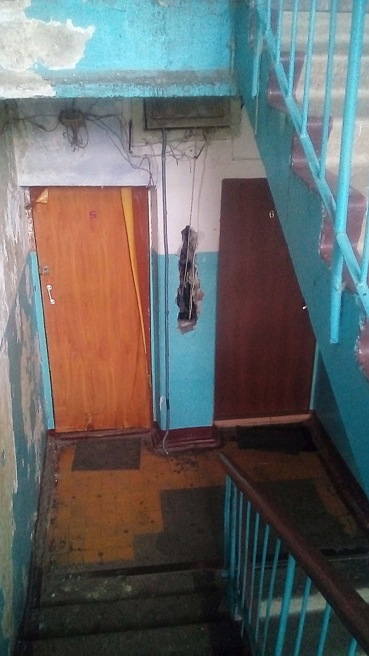 Подъезд необходимо привести в порядок – заделать дыры в стенах, спрятать провода, покрасить стены на каждом этаже (они грязные и облезшие), привести в порядок разрушающиеся лестницы. И найти и устранить причину отчетливого запаха канализации.