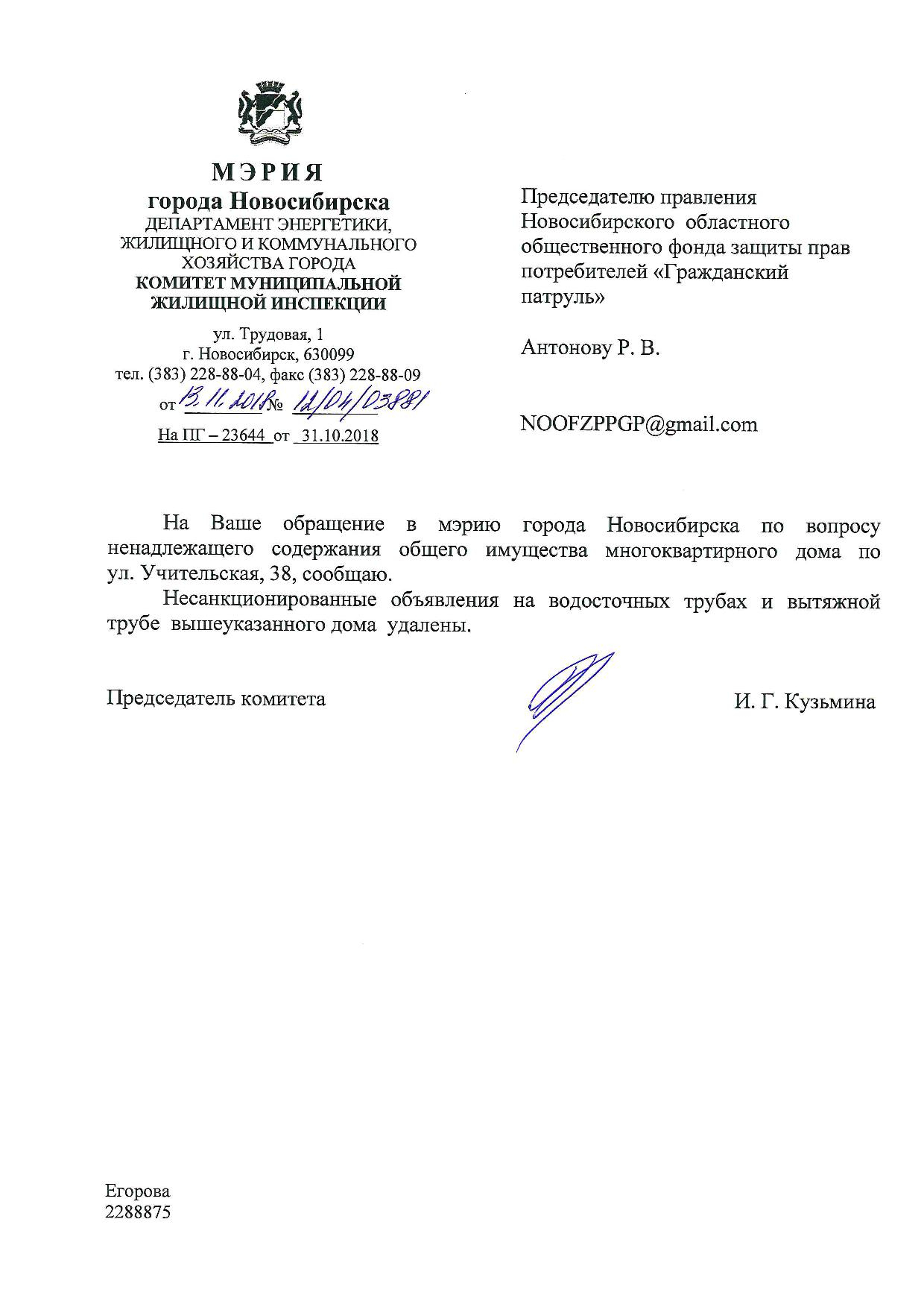 Номер жалобы:44334 Тип жалобы:Иные проблемы ЖКХ Название объекта:Управляющая Компания Регион:Новосибирская область Город:Новосибирск Адрес:ул. Учительская, 40 Описание жалобы:Объявления в неположенном месте Статус: