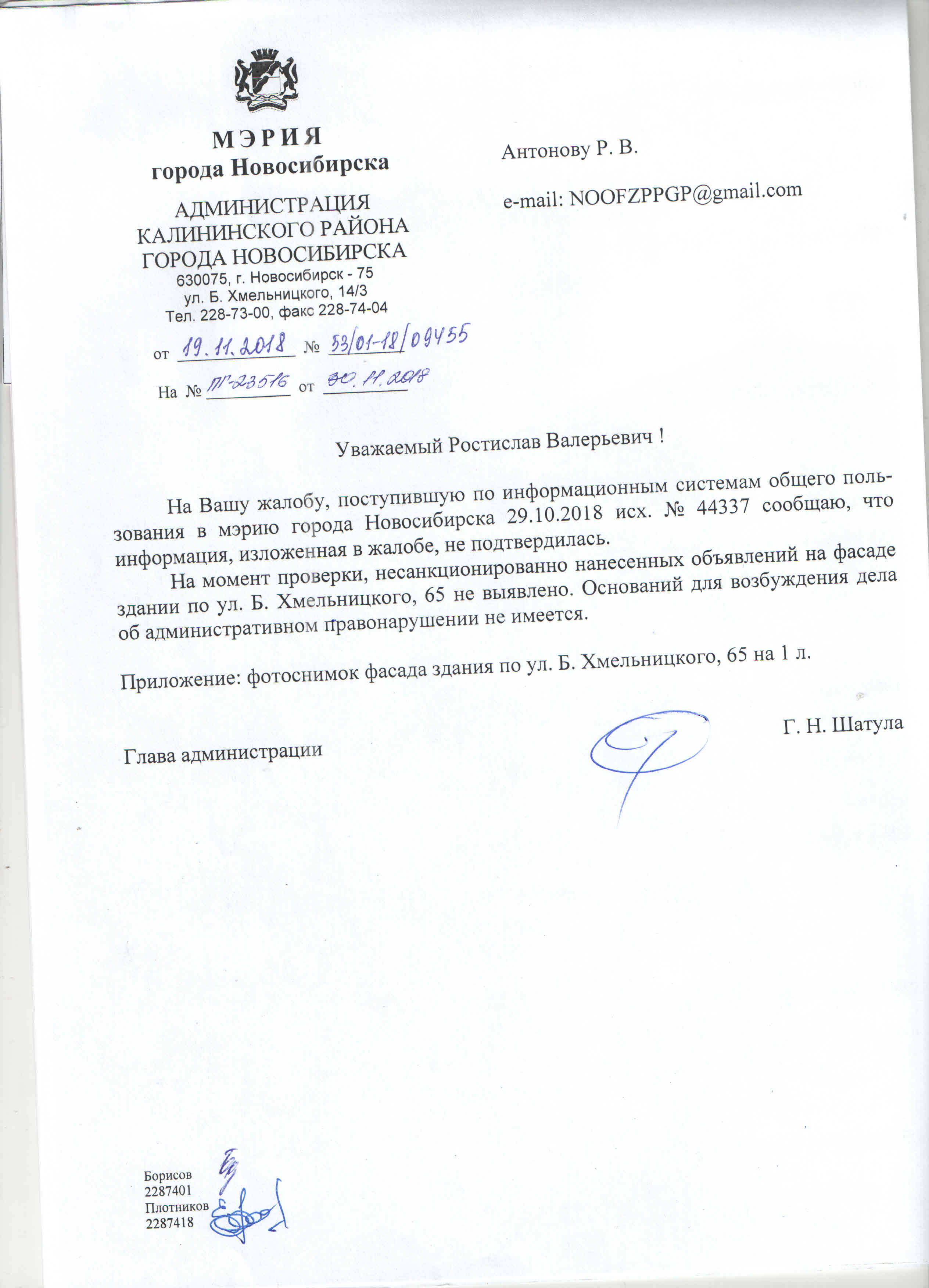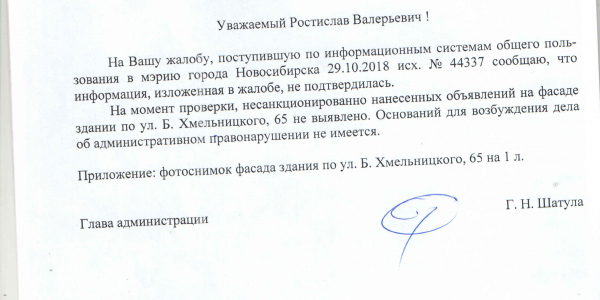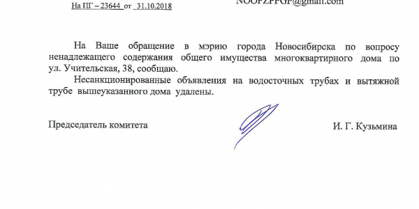 Номер жалобы:44337 Тип жалобы:Иные проблемы ЖКХ Название объекта:Управляющая Компания Регион:Новосибирская область Город:Новосибирск Адрес:ул. Богдана Хмельницкого, 65 Описание жалобы:Объявления в неположенном месте Статус: