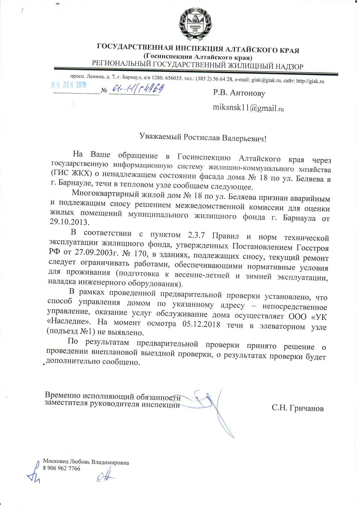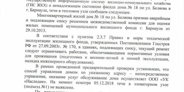 Номер жалобы:44431 Тип жалобы:Иные проблемы ЖКХ Название объекта:Ук «Старый Город» Город:Барнаул Адрес:Барнаул, 18 улица Беляева Описание жалобы:Дому не уделяется внимания-козырьки обвалились,в тепловом узле течь,штукатурка с фасада сыпется ,сосульки на крыше все предидущие сезоны огромные висели. На жалобы в диспетчерскую отвечают грубо,и мер никаких не принимают Статус:
