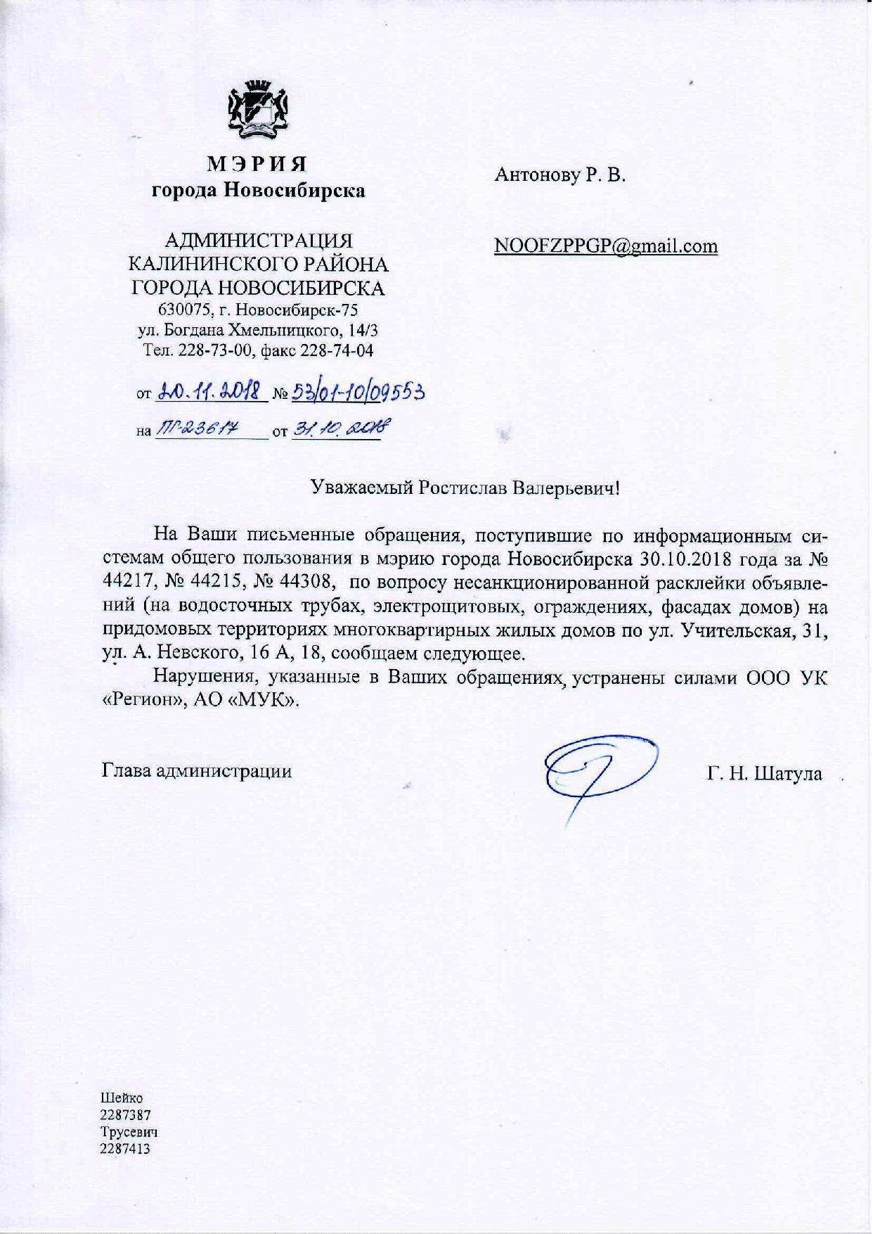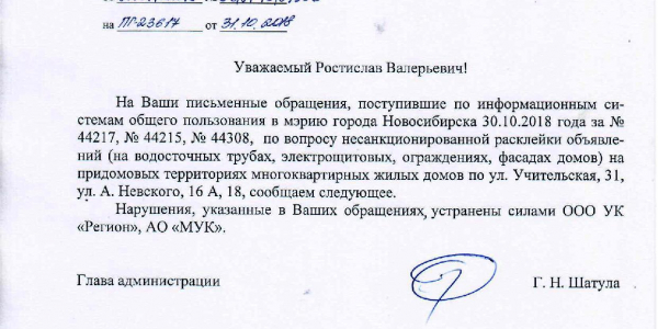 Номер жалобы:44307 Тип жалобы:Иные проблемы ЖКХ Название объекта:Управляющая Компания Регион:Новосибирская область Город:Новосибирск Адрес:ул. Учительская, 31 Описание жалобы:Народная 69, объявления в неположенном месте Статус: