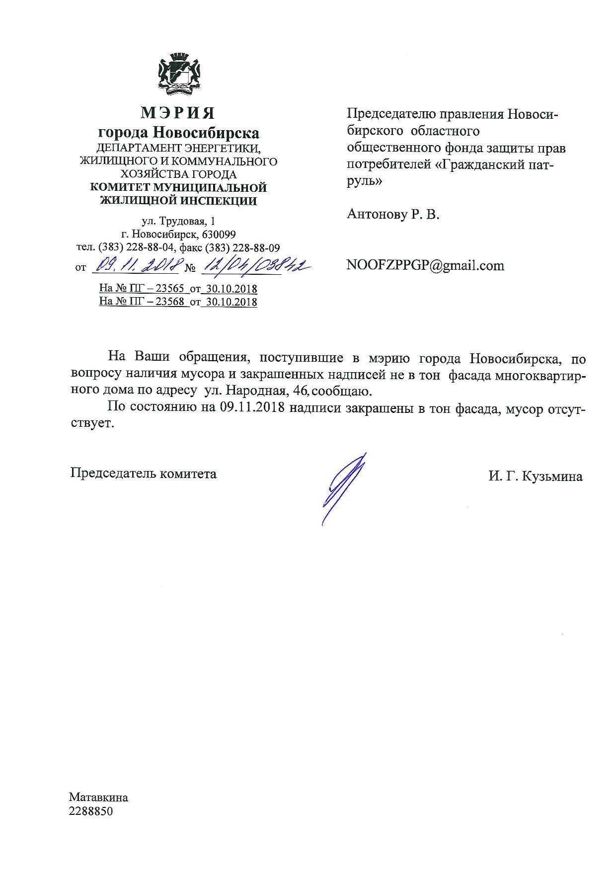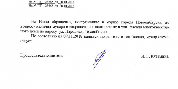 Номер жалобы:44300 Тип жалобы:Иные проблемы ЖКХ Название объекта:Управляющая Компания Регион:Новосибирская область Город:Новосибирск Адрес:ул. Народная, 46 Описание жалобы:Надписи на фасаде дома закрашены не в тон Статус: