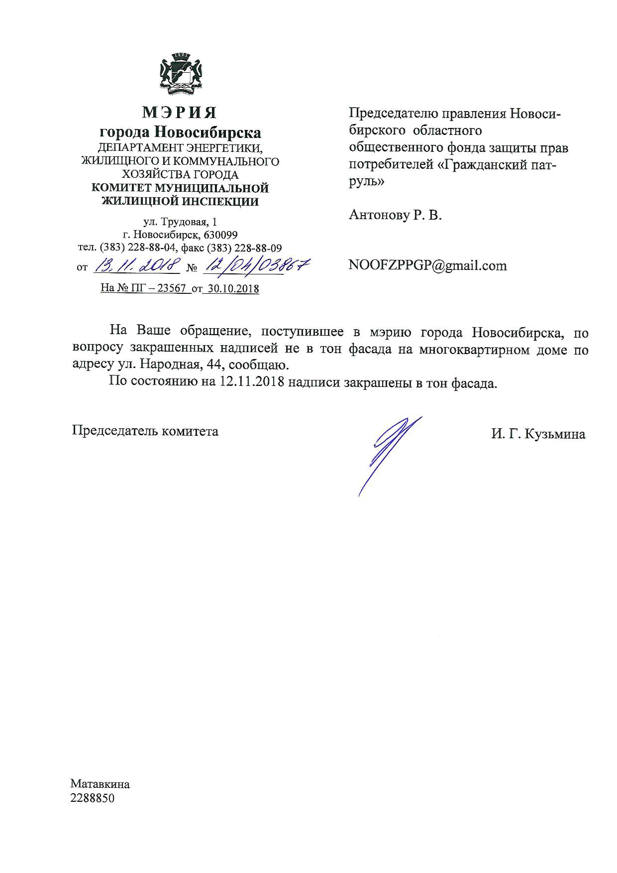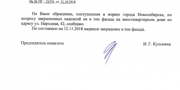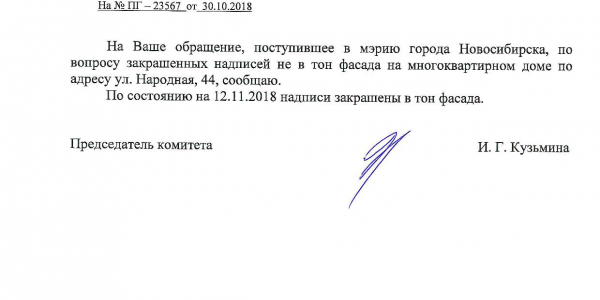 Номер жалобы:44301 Тип жалобы:Иные проблемы ЖКХ Название объекта:Управляющая Компания Регион:Новосибирская область Город:Новосибирск Адрес:ул. Народная, 44 Описание жалобы:Надписи на фасаде дома закрашены не в тон Статус: