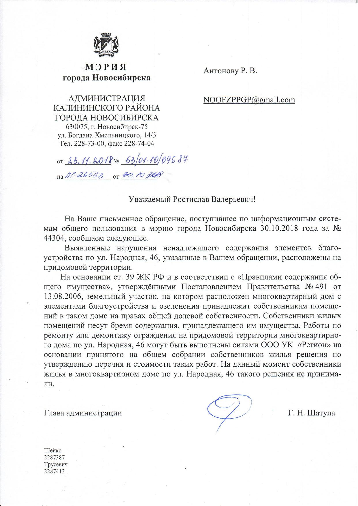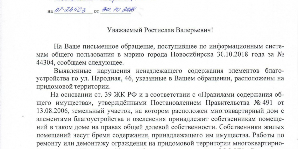 Номер жалобы:44302 Тип жалобы:Иные проблемы ЖКХ Название объекта:Управляющая Компания Регион:Новосибирская область Город:Новосибирск Адрес:ул. Народная, 46 Описание жалобы:Сломанный забор во дворе дома Статус: