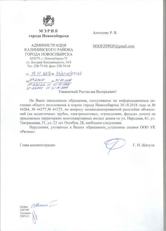 Номер жалобы:44277 Тип жалобы:Иные проблемы ЖКХ Название объекта:Управляющая Компания Регион:Новосибирская область Город:Новосибирск Адрес:Театральная ул., 31 Описание жалобы:Объявления в неположенном месте Статус: