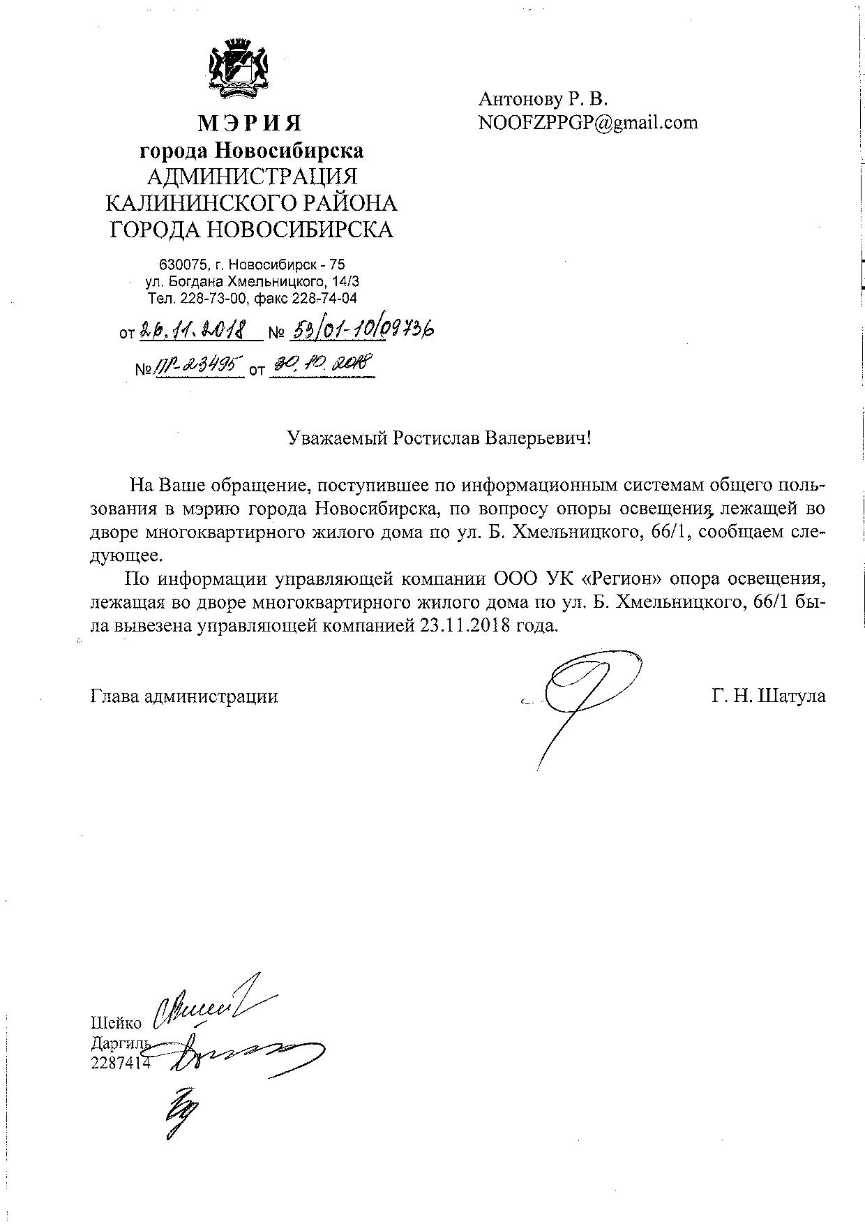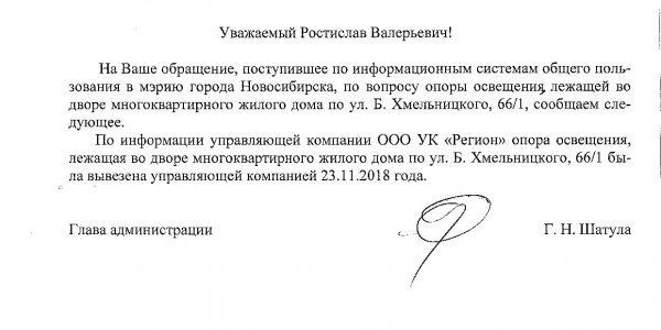 Номер жалобы:44282 Тип жалобы:Иные проблемы ЖКХ Название объекта:Управляющая Компания Регион:Новосибирская область Город:Новосибирск Адрес:ул. Богдана Хмельницкого, 66/1 Описание жалобы:Столб во дворе дома Статус: