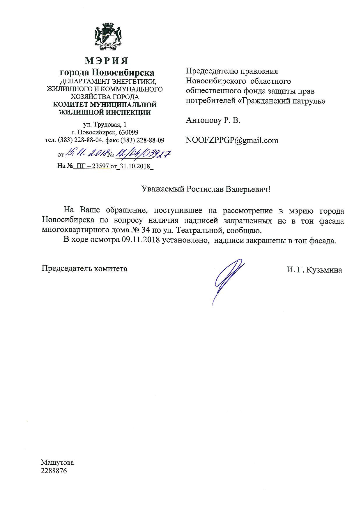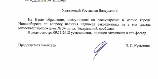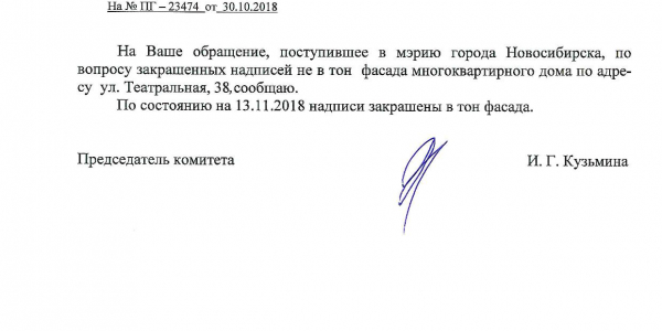 Номер жалобы:44283 Тип жалобы:Иные проблемы ЖКХ Название объекта:Управляющая Компания Регион:Новосибирская область Город:Новосибирск Адрес:ул. Театральная, 34 Описание жалобы:Надписи закрашены не в тон Статус: