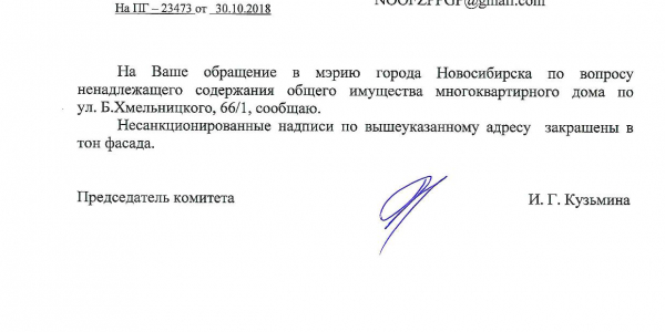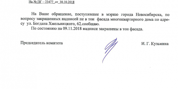 Номер жалобы:44281 Тип жалобы:Иные проблемы ЖКХ Название объекта:Управляющая Компания Регион:Новосибирская область Город:Новосибирск Адрес:ул. Богдана Хмельницкого, 66/1 Описание жалобы:Надписи на фасаде дома закрашены не в тон Статус: