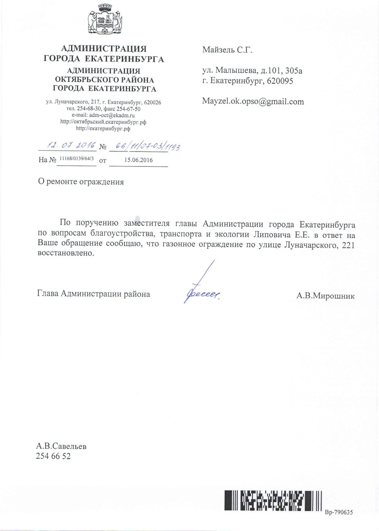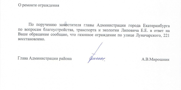 Номер жалобы:3712 Тип жалобы:Ненадлежащее содержание малых архитектурных форм Название объекта:Администрация Екатеринбурга Регион:Свердловская область Город:Екатеринбург Адрес:ул. Луначарского, 221 Описание жалобы:Необходимо восстановление ограждения газона Статус: