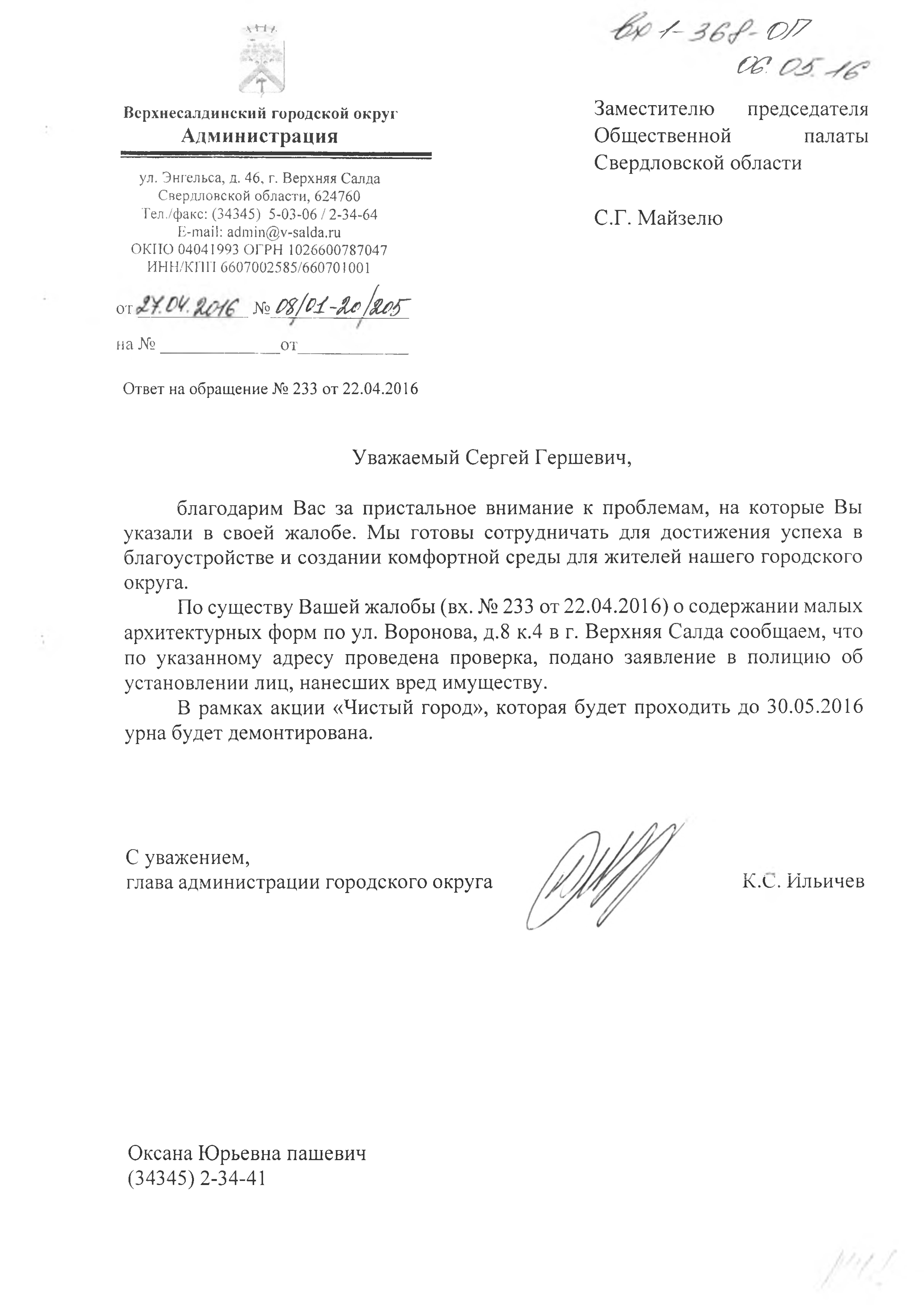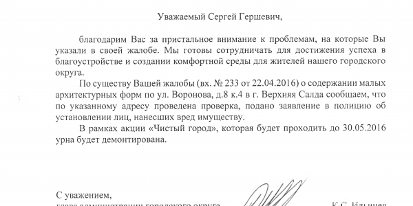 Номер жалобы:3849 Тип жалобы:Ненадлежащее содержание малых архитектурных форм Название объекта:Верхняя Салда Регион:Свердловская область Город:Верхняя Салда Адрес:ул. Воронова, 8/4 Описание жалобы:Разрушенная урна Статус: