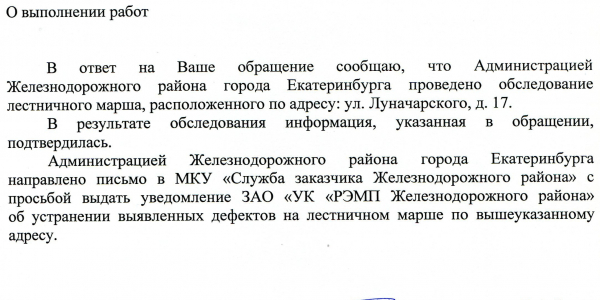 Номер жалобы:3624 Тип жалобы:Ненадлежащее содержание малых архитектурных форм Название объекта:Администрация г. Екатеринбурга Регион:Свердловская область Город:Екатеринбург Адрес:улица Азина, 16 Описание жалобы:Разрушены ступеньки. Статус: