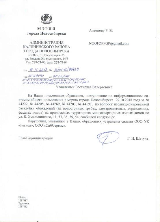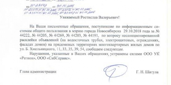 Номер жалобы:44203 Тип жалобы:Иные проблемы ЖКХ Название объекта:Управляющая Компания Регион:Новосибирская область Город:Новосибирск Адрес:ул. Богдана Хмельницкого, 33 Описание жалобы:Объявления в неположенном месте Статус: