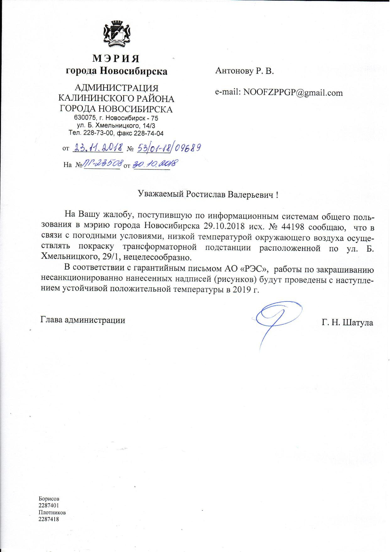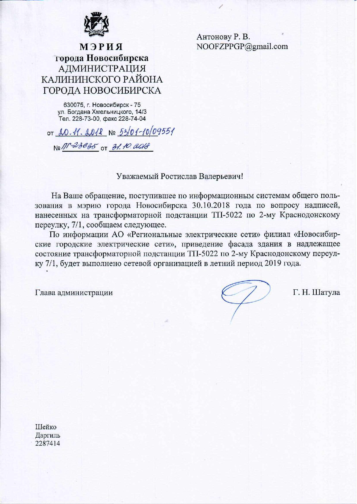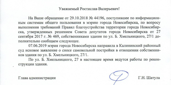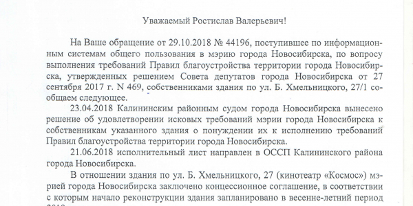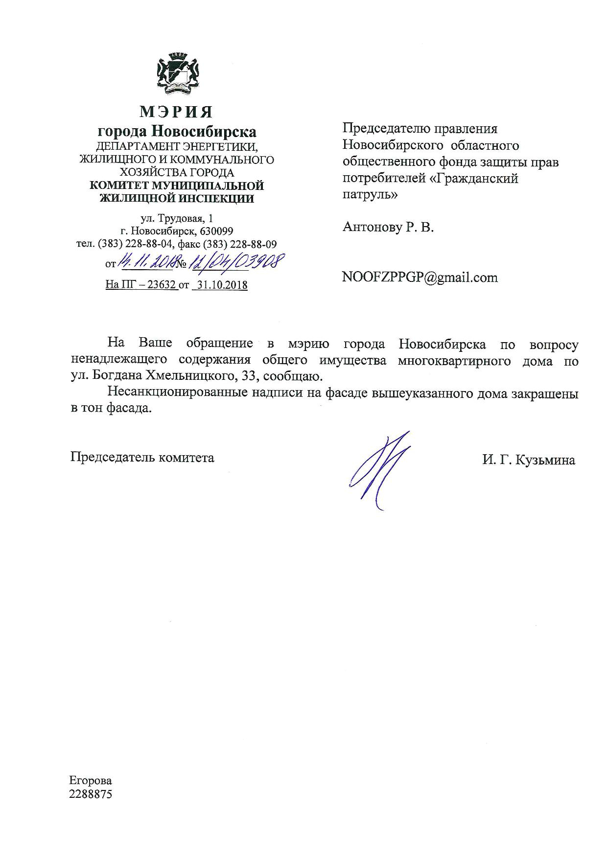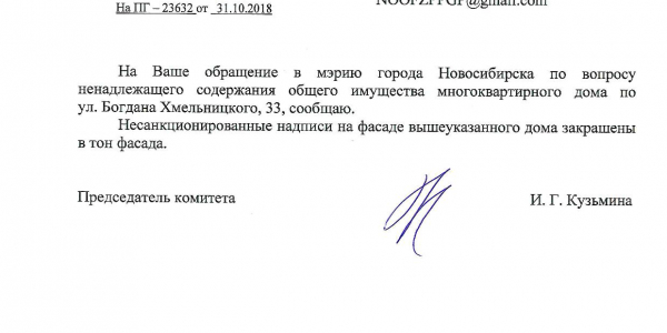 Номер жалобы:44202 Тип жалобы:Иные проблемы ЖКХ Название объекта:Управляющая Компания Регион:Новосибирская область Город:Новосибирск Адрес:2-й Краснодонский пер., 5/33 Описание жалобы:Богдана Хмельницкого 33, надписи на фасаде дома закрашены не в тон Статус: