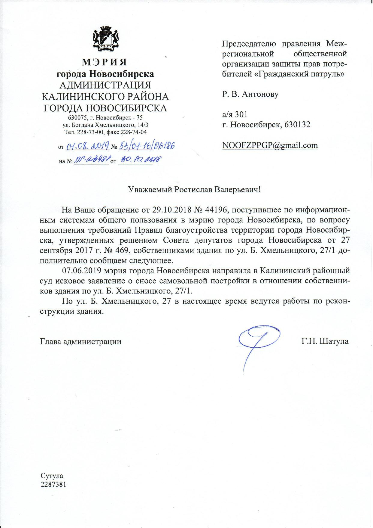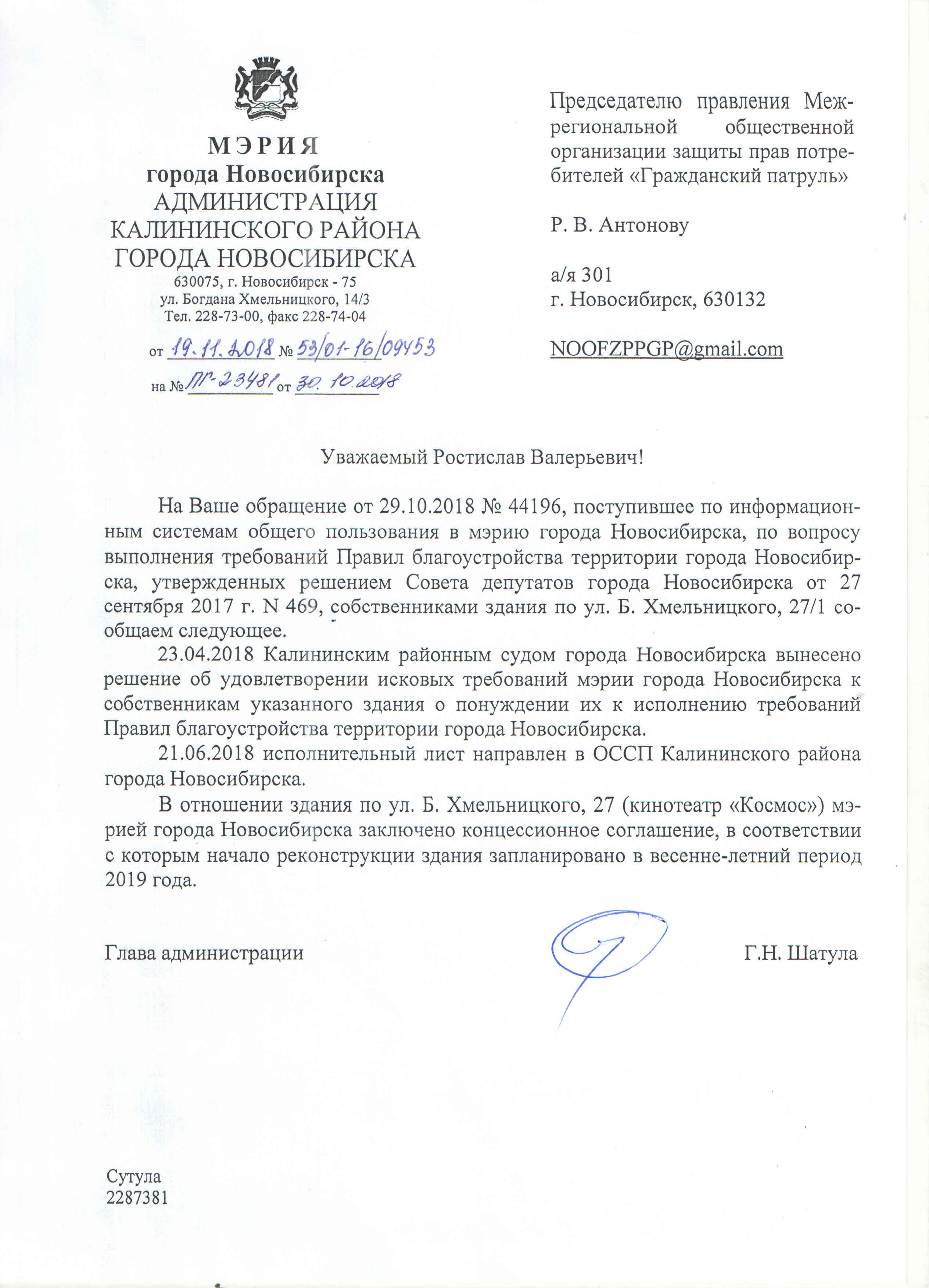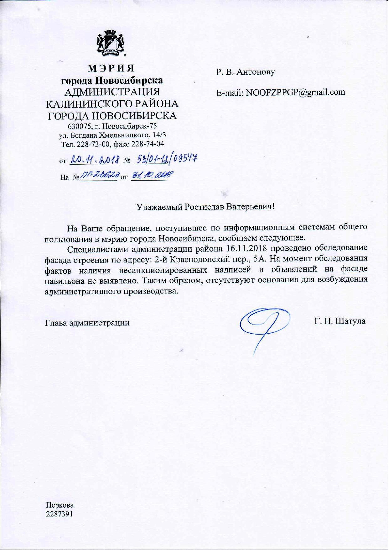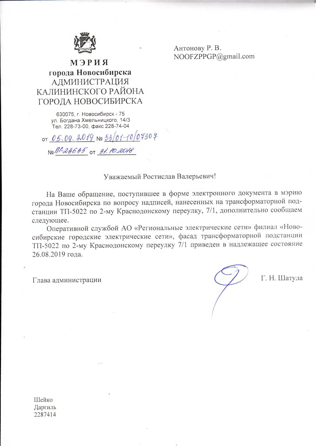 Номер жалобы:44202 Тип жалобы:Иные проблемы ЖКХ Название объекта:Управляющая Компания Регион:Новосибирская область Город:Новосибирск Адрес:2-й Краснодонский пер., 5/33 Описание жалобы:Богдана Хмельницкого 33, надписи на фасаде дома закрашены не в тон Статус: