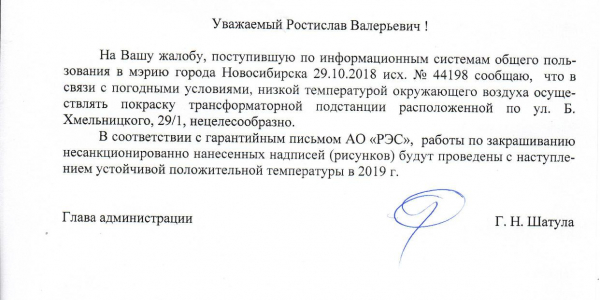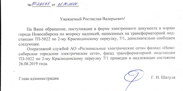 Номер жалобы:44198 Тип жалобы:Иные проблемы ЖКХ Название объекта:Управляющая Компания Регион:Новосибирская область Город:Новосибирск Адрес:ул. Богдана Хмельницкого, 29/2 Описание жалобы:Надписи на хозяйственном корпусе за домом Статус: