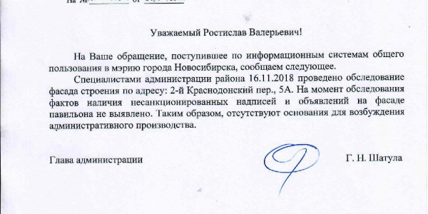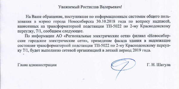 Номер жалобы:44201 Тип жалобы:Иные проблемы ЖКХ Название объекта:Управляющая Компания Регион:Новосибирская область Город:Новосибирск Адрес:2-й Краснодонский пер., 7/1 Описание жалобы:Надписи на хозяйственном корпусе Статус: