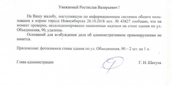 Номер жалобы:43832 Тип жалобы:Иные проблемы ЖКХ Название объекта:Управляющая Компания Регион:Новосибирская область Город:Новосибирск Адрес:ул. Объединения, 90/1 Описание жалобы:Надписи на фасаде дома закрашены не в тон Статус:
