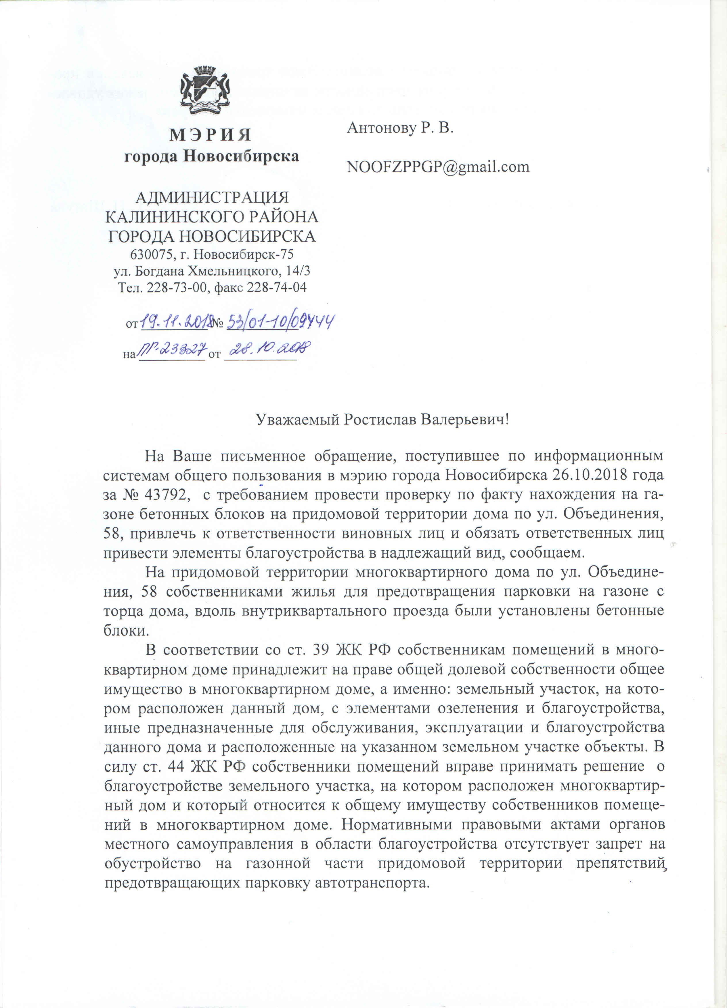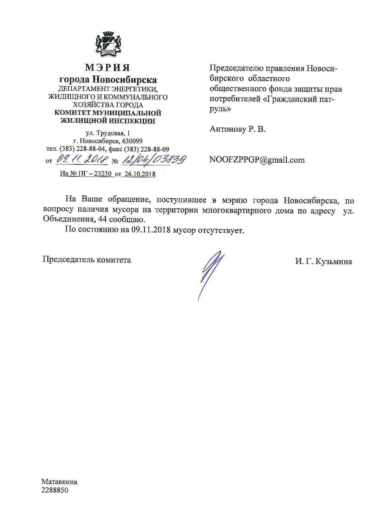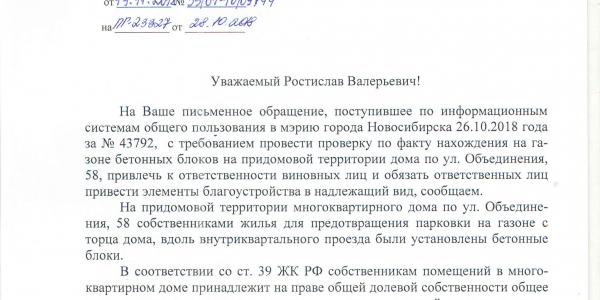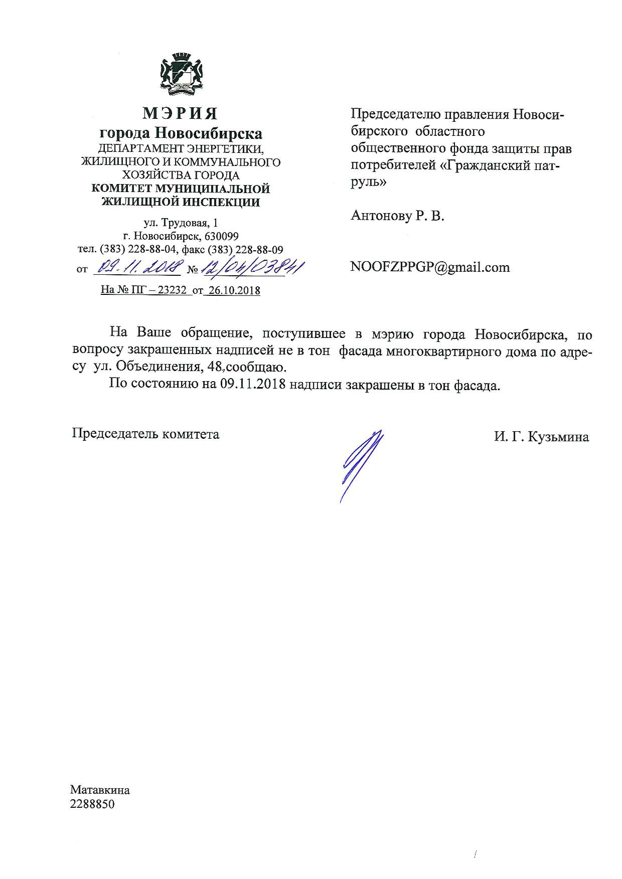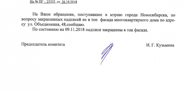 Номер жалобы:43791 Тип жалобы:Иные проблемы ЖКХ Название объекта:Управляющая Компания Регион:Новосибирская область Город:Новосибирск Адрес:ул. Объединения, Новосибирск Описание жалобы:Объединения 58, надписи на хозяйственном корпусе Статус: