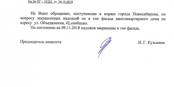 Номер жалобы:43785 Тип жалобы:Иные проблемы ЖКХ Название объекта:Управляющая Компания Регион:Новосибирская область Город:Новосибирск Адрес:ул. Объединения, 42 Описание жалобы:Надписи на фасаде дома закрашены не в тон Статус: