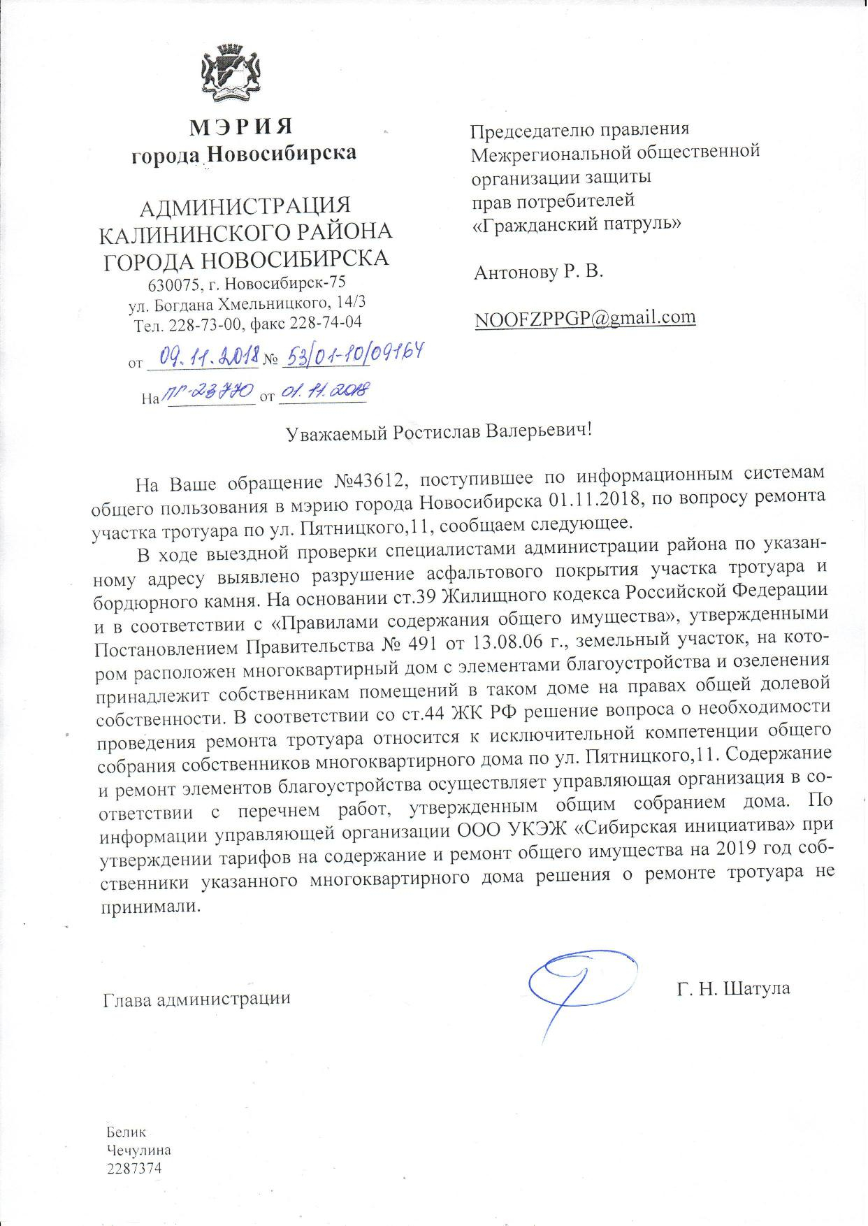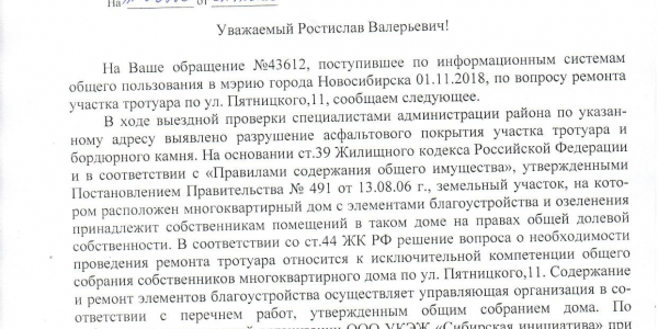 Номер жалобы:43612 Тип жалобы:Иные проблемы ЖКХ Название объекта:Управляющая Компания Регион:Новосибирская область Город:Новосибирск Адрес:ул. Пятницкого, 11 Описание жалобы:Разрушен тротуар Статус: