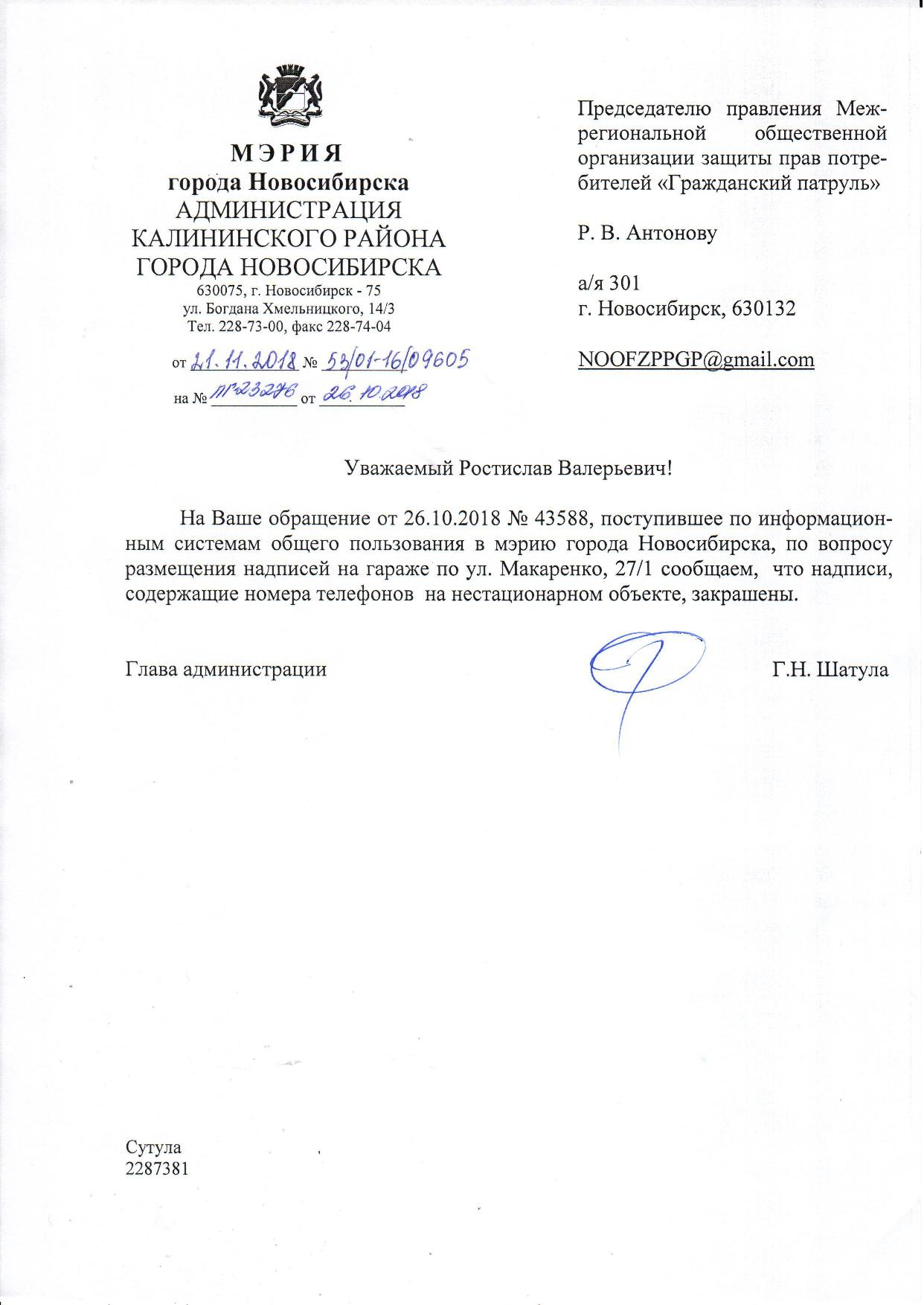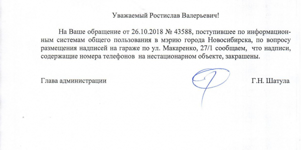 Номер жалобы:43588 Тип жалобы:Иные проблемы ЖКХ Название объекта:Управляющая Компания Регион:Новосибирская область Город:Новосибирск Адрес:ул. Макаренко, 27/1 Описание жалобы:Надписи на гараже Статус: