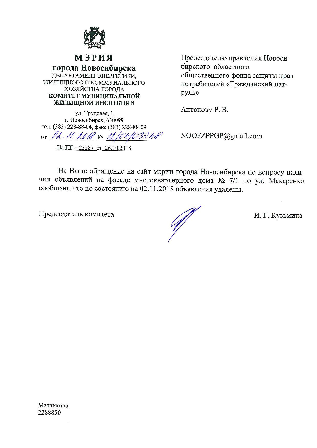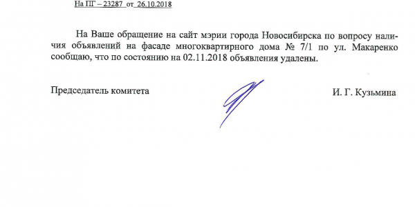 Номер жалобы:43548 Тип жалобы:Иные проблемы ЖКХ Название объекта:Управляющая Компания Регион:Новосибирская область Город:Новосибирск Адрес:ул. Макаренко, 7/1 Описание жалобы:Объявления в неположенном месте Статус: