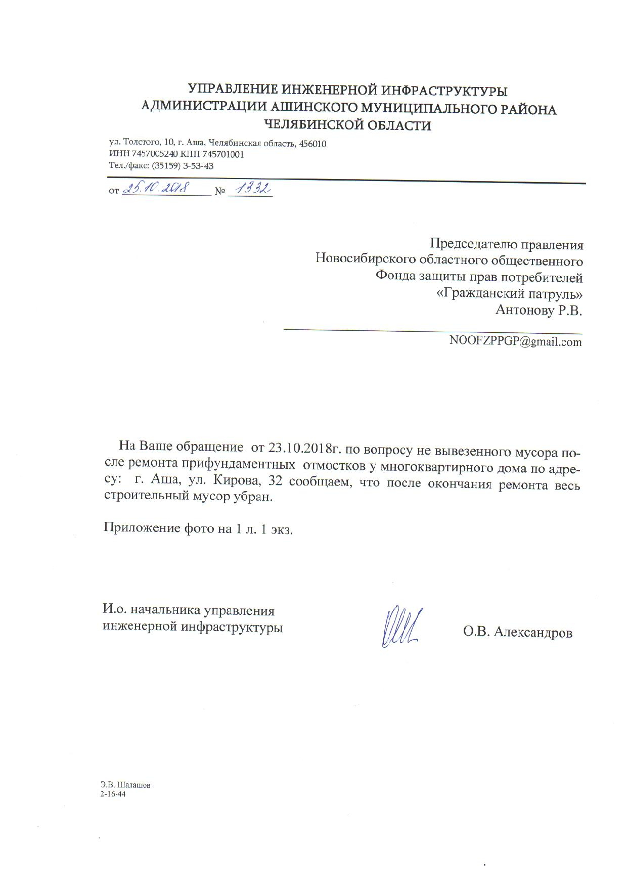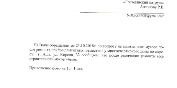 Номер жалобы:43227 Тип жалобы:Иные проблемы ЖКХ Название объекта:Администрация, ЖКХ. Город:Аша Адрес:Аша, 32 улица Кирова Описание жалобы:При ремонте фундамента дома 32 по ул.Кирова, организация не вывезла куски старого фундамента, лежит уже около месяца Статус: