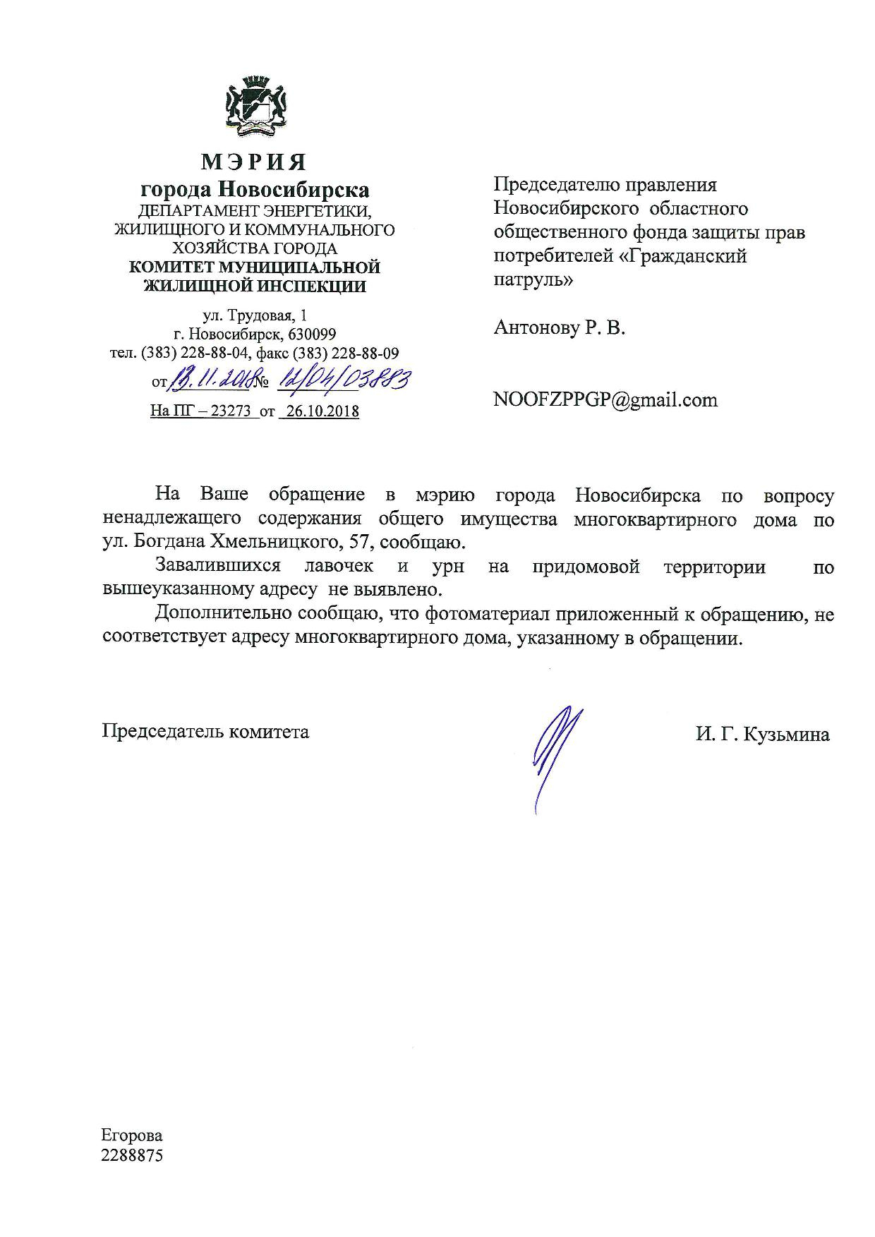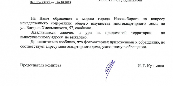 Номер жалобы:43367 Тип жалобы:Иные проблемы ЖКХ Название объекта:Управляющая Компания Город:Новосибирск Адрес:Новосибирск, 57 улица Богдана Хмельницкого Описание жалобы:Заявленная лавочка и мусорка Статус: