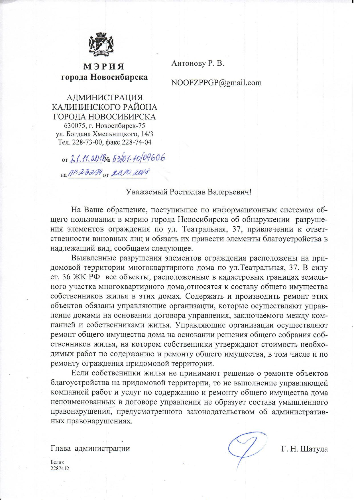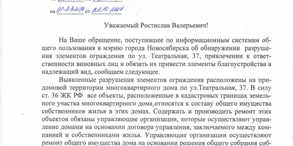 Номер жалобы:43382 Тип жалобы:Иные проблемы ЖКХ Название объекта:Управляющая Компания Город:Новосибирск Адрес:Новосибирск, 37 Театральная улица Описание жалобы:Сломанный забор Статус: