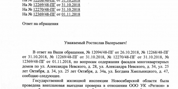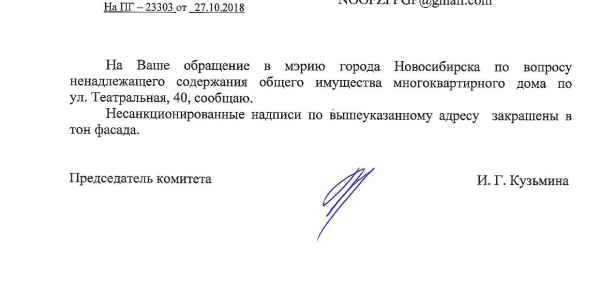 Номер жалобы:43379 Тип жалобы:Иные проблемы ЖКХ Название объекта:Управляющая Компания Город:Новосибирск Адрес:Новосибирск, 40 Театральная улица Описание жалобы:Фасад разрисован Статус: