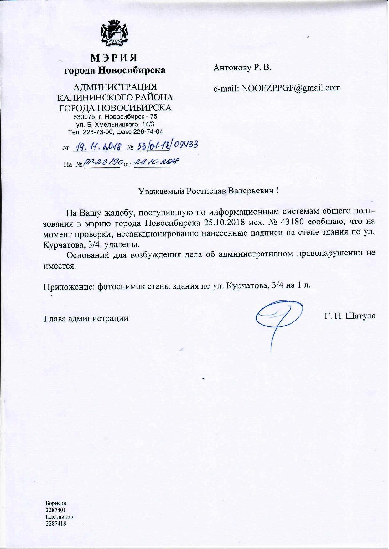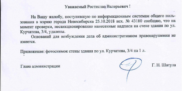 Номер жалобы:43180 Тип жалобы:Иные проблемы ЖКХ Название объекта:Управляющая Компания Город:Новосибирск Адрес:Новосибирск, 3/4 улица Курчатова Описание жалобы:Фасад здания разрисован Статус: