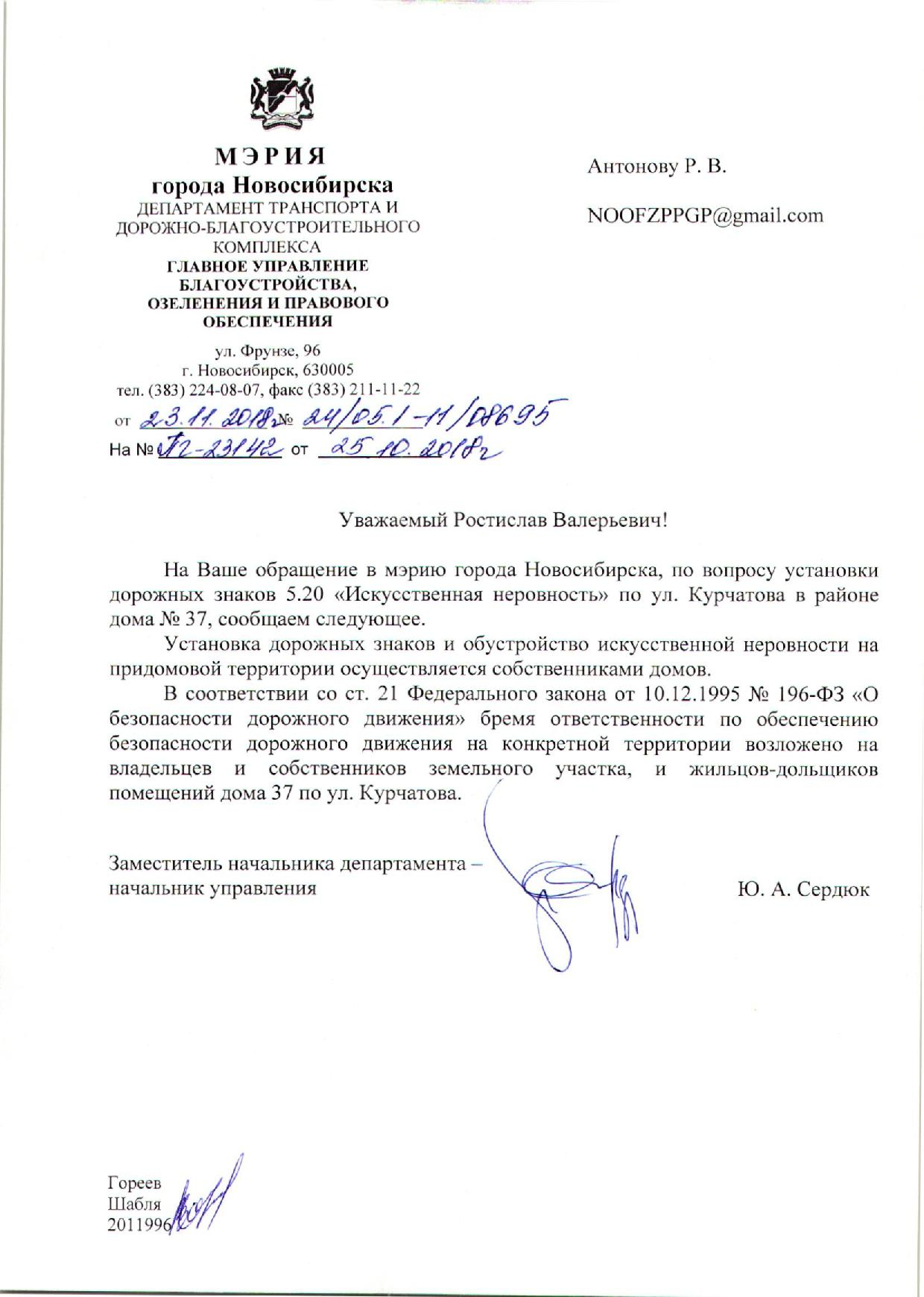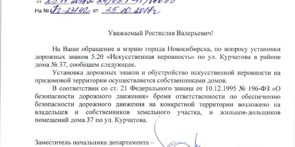 Номер жалобы:43197 Тип жалобы:Иные проблемы ЖКХ Название объекта:Управляющая Компания Город:Новосибирск Адрес:Новосибирск, 37 улица Курчатова Описание жалобы:Лежачий полицейский без знака Статус: