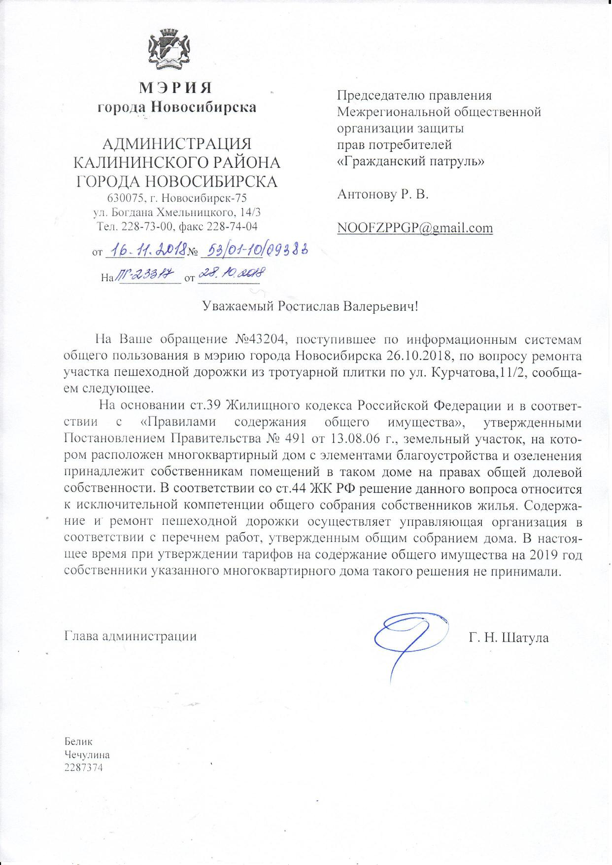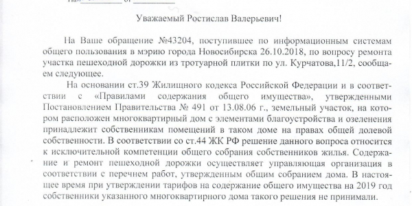 Номер жалобы:43204 Тип жалобы:Иные проблемы ЖКХ Название объекта:Управляющая Компания Город:Новосибирск Адрес:Новосибирск, 11/2 улица Курчатова Описание жалобы:нет тропинки Статус: