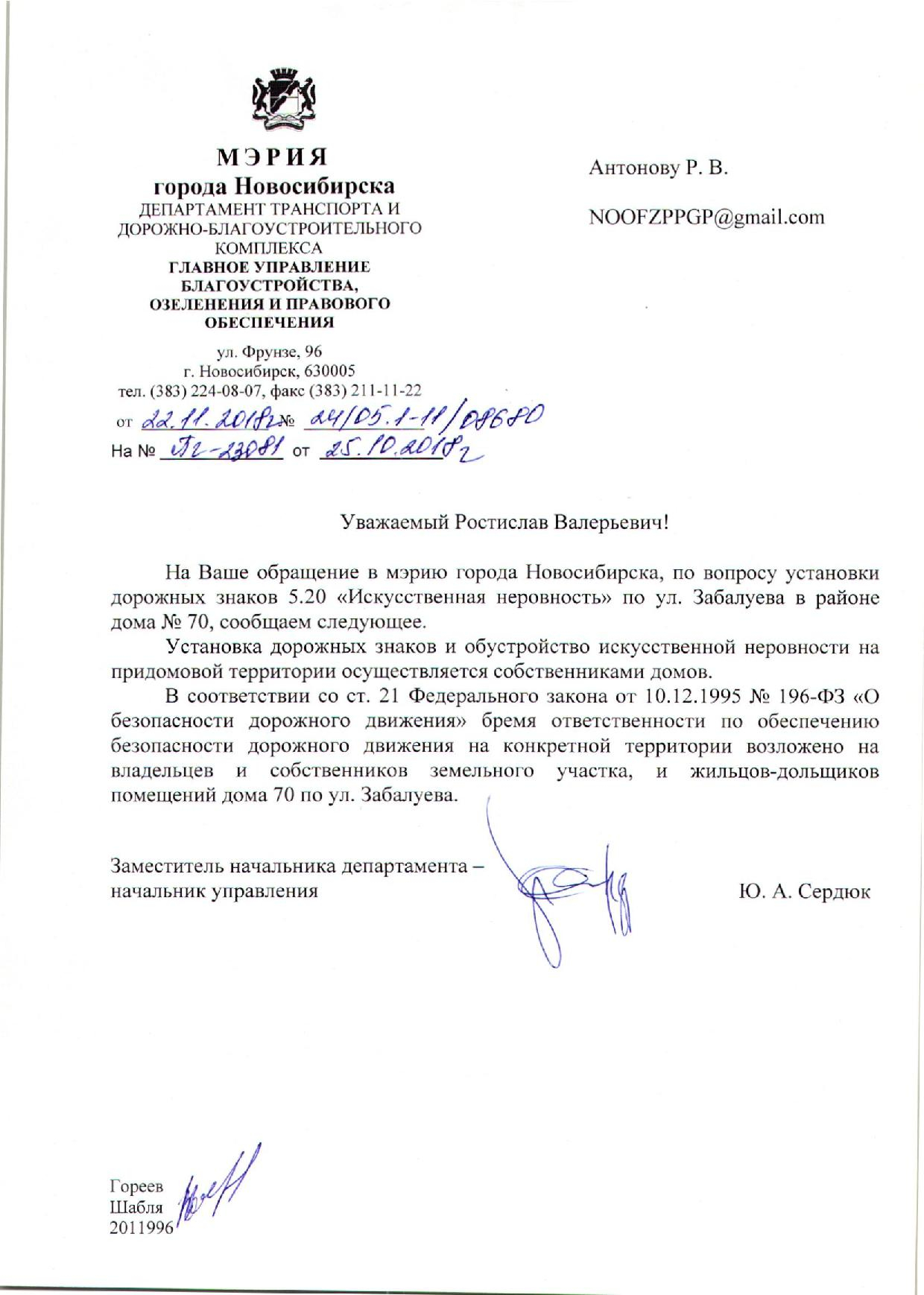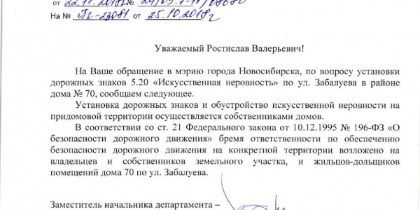 Номер жалобы:43131 Тип жалобы:Иные проблемы ЖКХ Название объекта:Управляющая Компания Город:Новосибирск Адрес:Новосибирск, 70А улица Забалуева Описание жалобы:Лежачий полицейский без знака Статус: