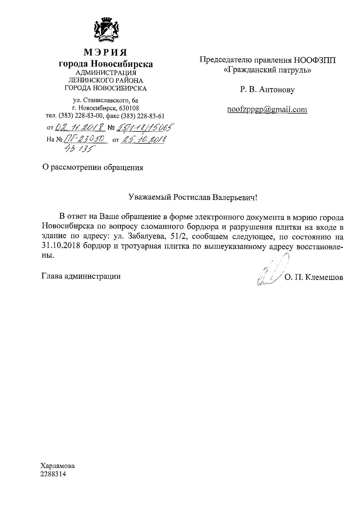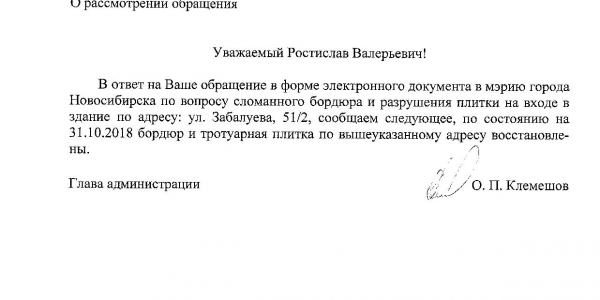 Номер жалобы:43135 Тип жалобы:Иные проблемы ЖКХ Название объекта:Управляющая Компания Город:Новосибирск Адрес:Новосибирск, 51/2 улица Забалуева Описание жалобы:Сломанный бордюр Статус: