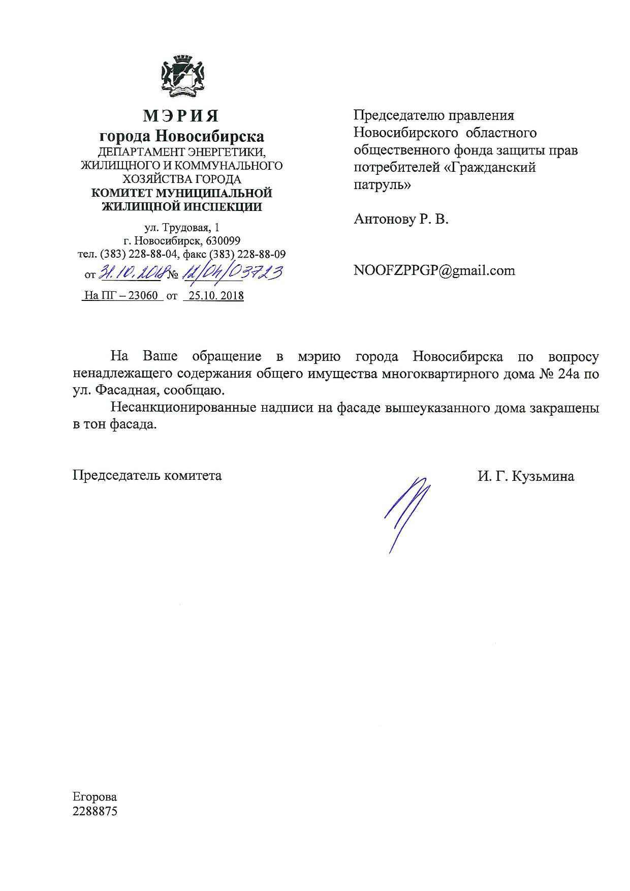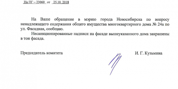 Номер жалобы:43166 Тип жалобы:Иные проблемы ЖКХ Название объекта:Управляющая Компания Город:Новосибирск Адрес:Новосибирск, 24А улица Фасадная Описание жалобы:фасад дома разрисован Статус: