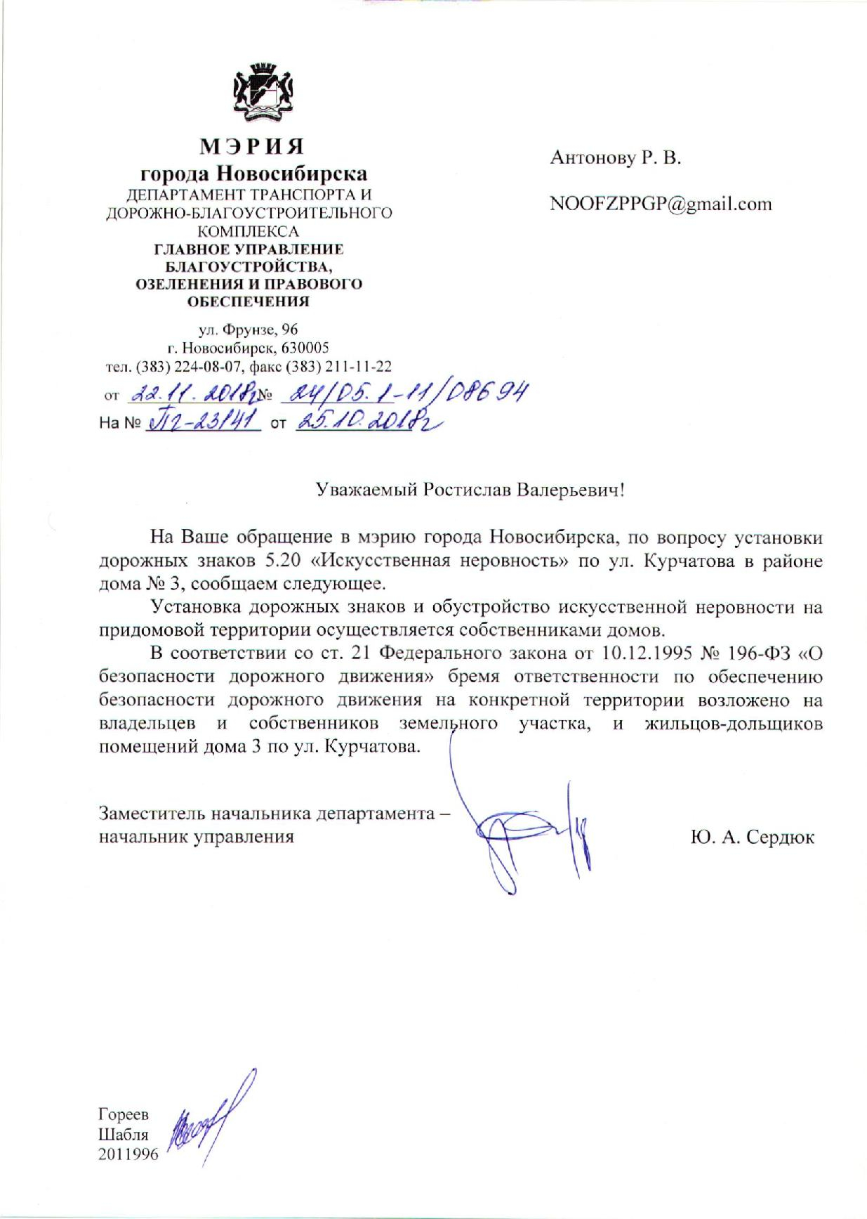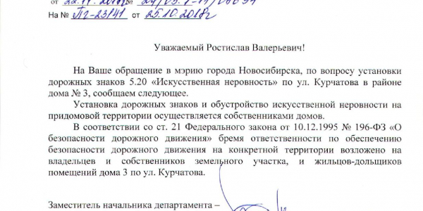 Номер жалобы:43179 Тип жалобы:Иные проблемы ЖКХ Название объекта:Управляющая Компания Город:Новосибирск Адрес:Новосибирск, 3к2 улица Курчатова Описание жалобы:Лежачий полицейский без знака (Курчатова 3) Статус: