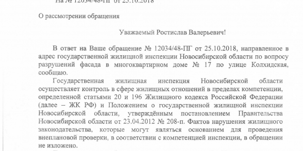 Номер жалобы:43161 Тип жалобы:Иные проблемы ЖКХ Название объекта:Управляющая Компания Город:Новосибирск Адрес:Новосибирск, 17 улица Колхидская Описание жалобы:Рушится фасад здания, фасад разрисован Статус: