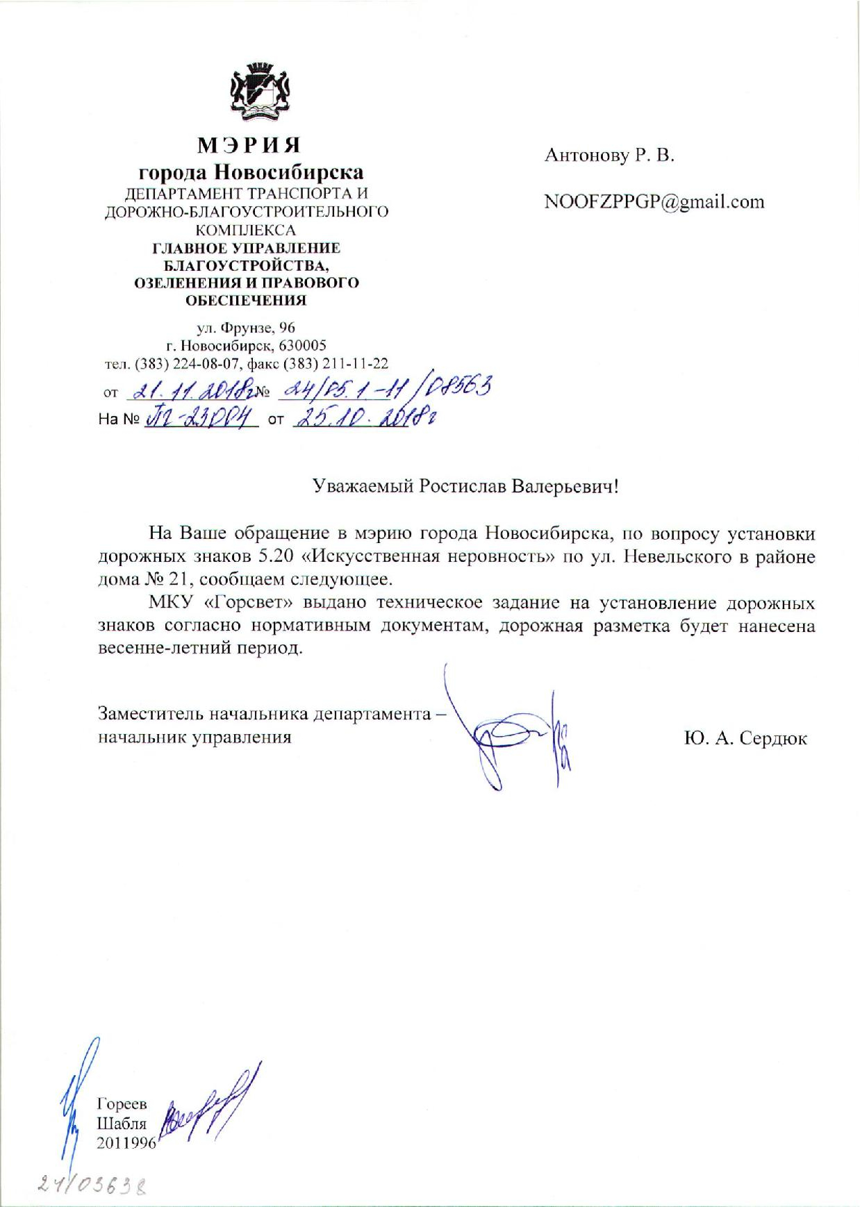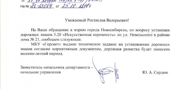 Номер жалобы:43097 Тип жалобы:Иные проблемы ЖКХ Название объекта:Управляющая Компания Город:Новосибирск Адрес:Новосибирск, 23 улица Невельского Описание жалобы:Лежачий полицейский без знака Статус:
