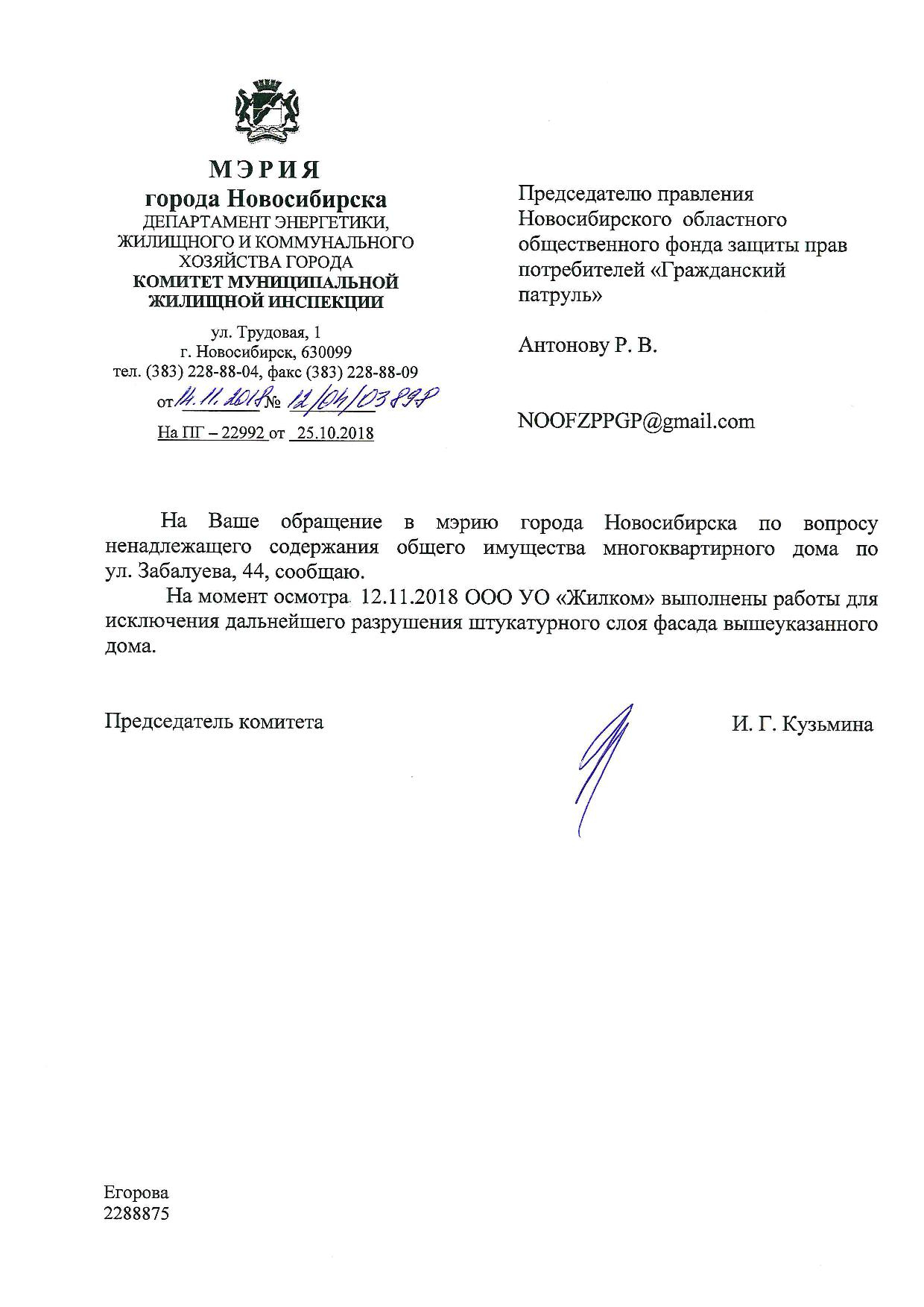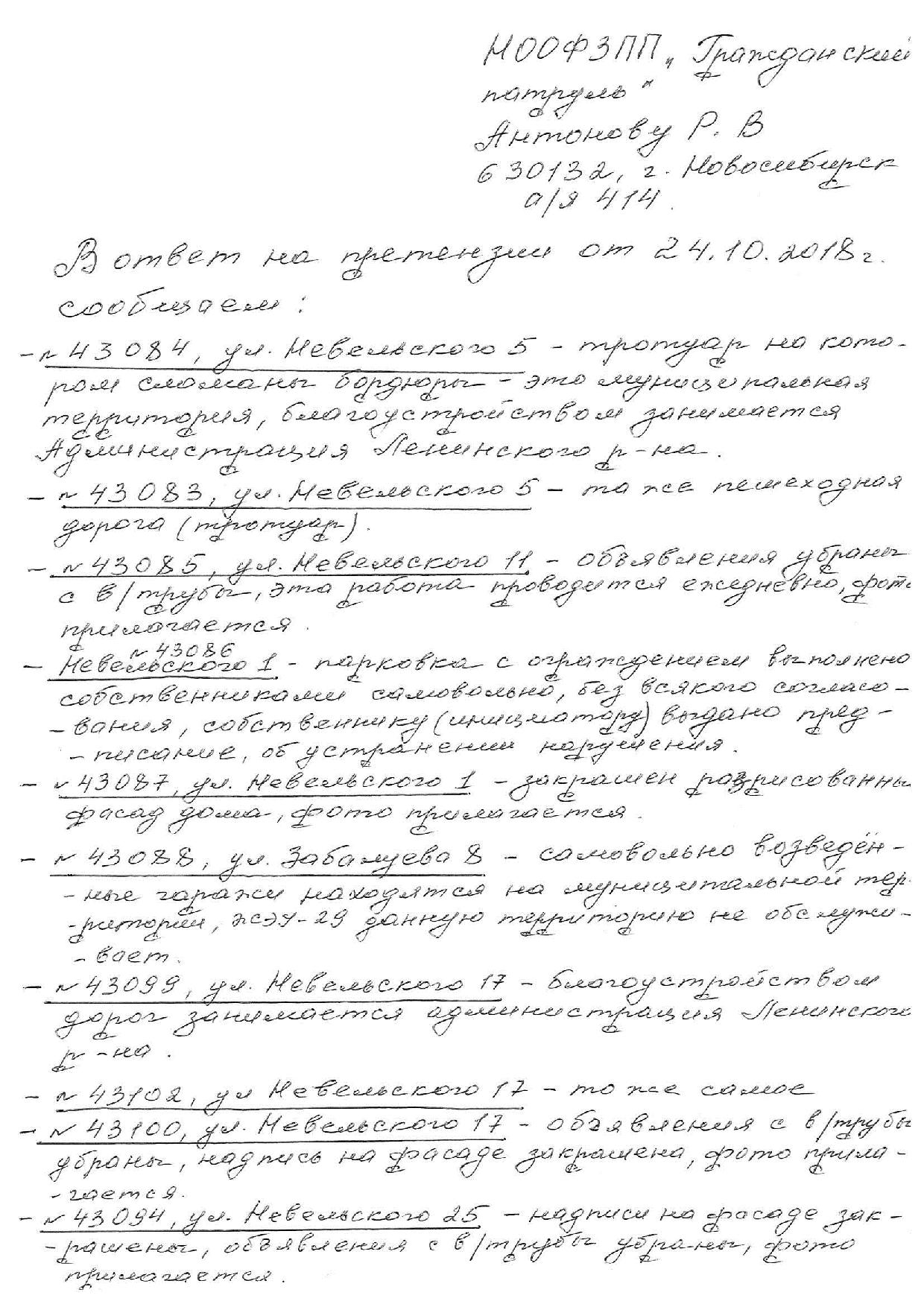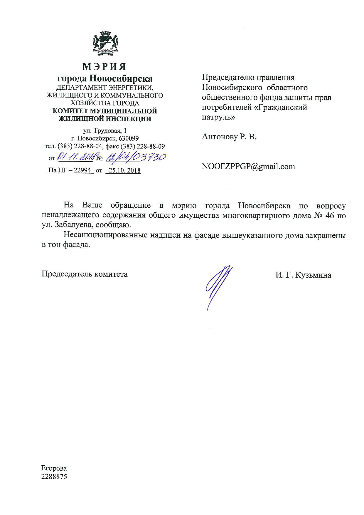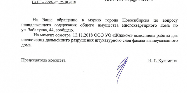 Номер жалобы:43118 Тип жалобы:Иные проблемы ЖКХ Название объекта:Управляющая Компания Город:Новосибирск Адрес:Новосибирск, 46 улица Забалуева Описание жалобы:разрисован фасад здания Статус:
