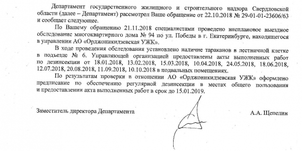 Номер жалобы:43015 Тип жалобы:Иные проблемы ЖКХ Название объекта:Орджоникидзевская УЖК Регион:Свердловская область Город:Екатеринбург Адрес:ул. Победы, 94 Описание жалобы:В подъезде 6 тараканы ползают по стенам. Также ползают по стенам дома снаружи, не раз были встречены с наружной стороны окон. Статус: