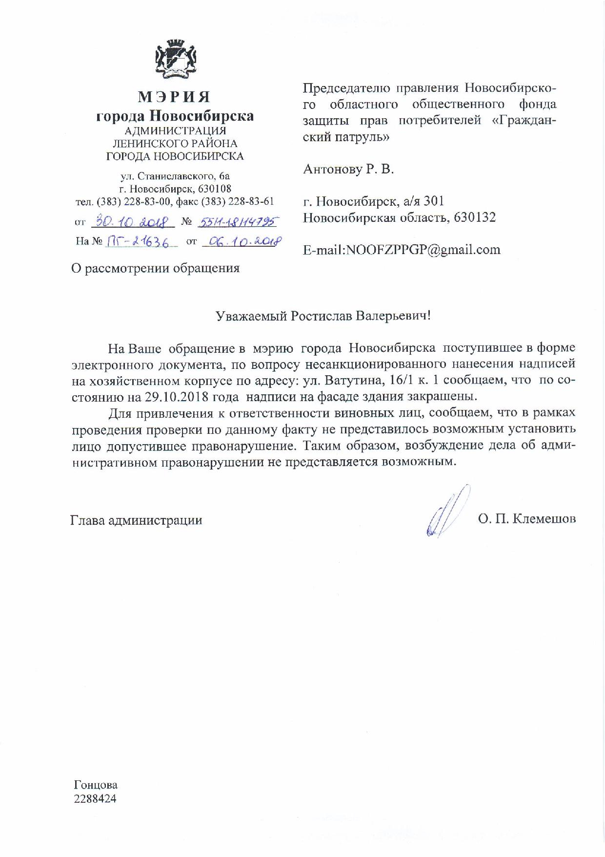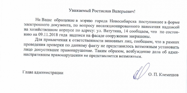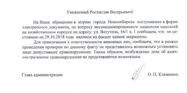 Номер жалобы:42237 Тип жалобы:Иные проблемы ЖКХ Название объекта:Управляющая Компания Регион:Новосибирская область Город:Новосибирск Адрес:ул. Ватутина, 14 Описание жалобы:Надписи на хозяйственном корпусе Статус: