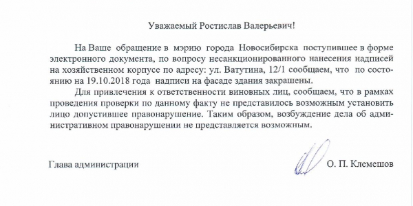 Номер жалобы:42239 Тип жалобы:Иные проблемы ЖКХ Название объекта:Управляющая Компания Регион:Новосибирская область Город:Новосибирск Адрес:ул. Ватутина, 12 Описание жалобы:Ватутина 12/1, надписи на хозяйственном корпусе Статус: