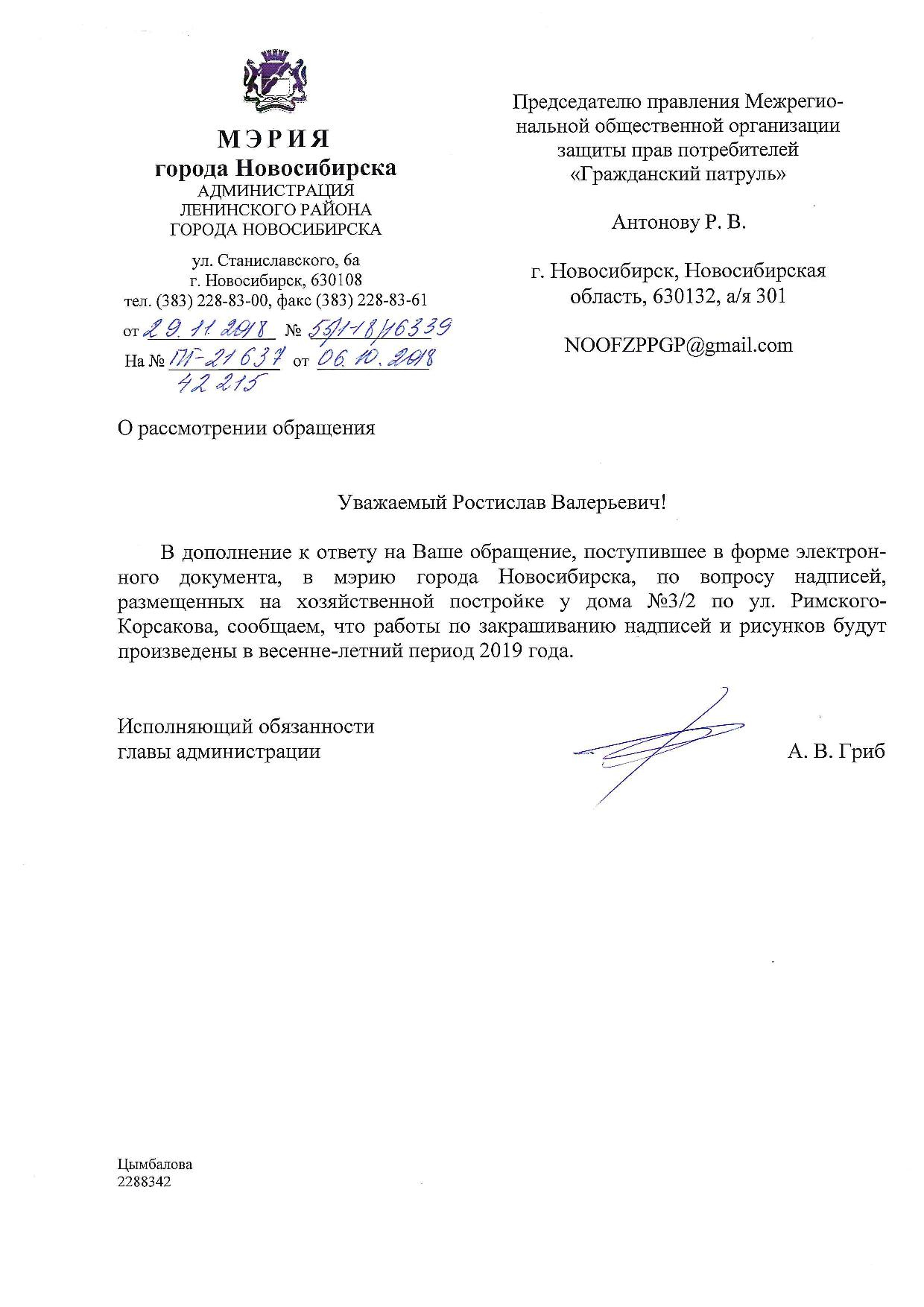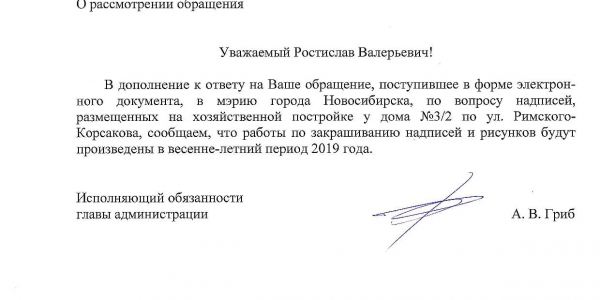 Номер жалобы:42215 Тип жалобы:Иные проблемы ЖКХ Название объекта:Управляющая Компания Регион:Новосибирская область Город:Новосибирск Адрес:ул. Римского-Корсакова, 3/2 Описание жалобы:Надписи на хозяйственном корпусе Статус: