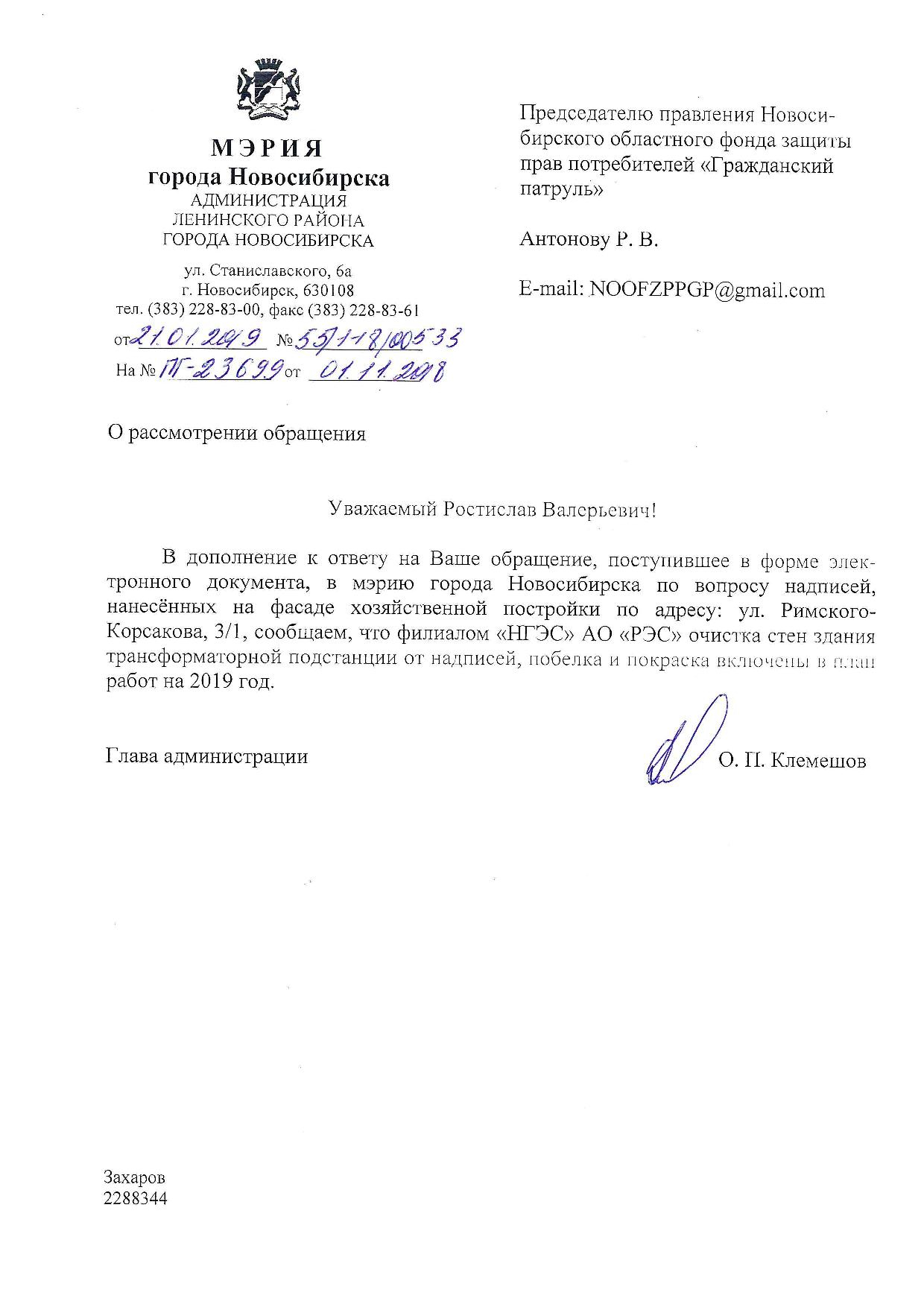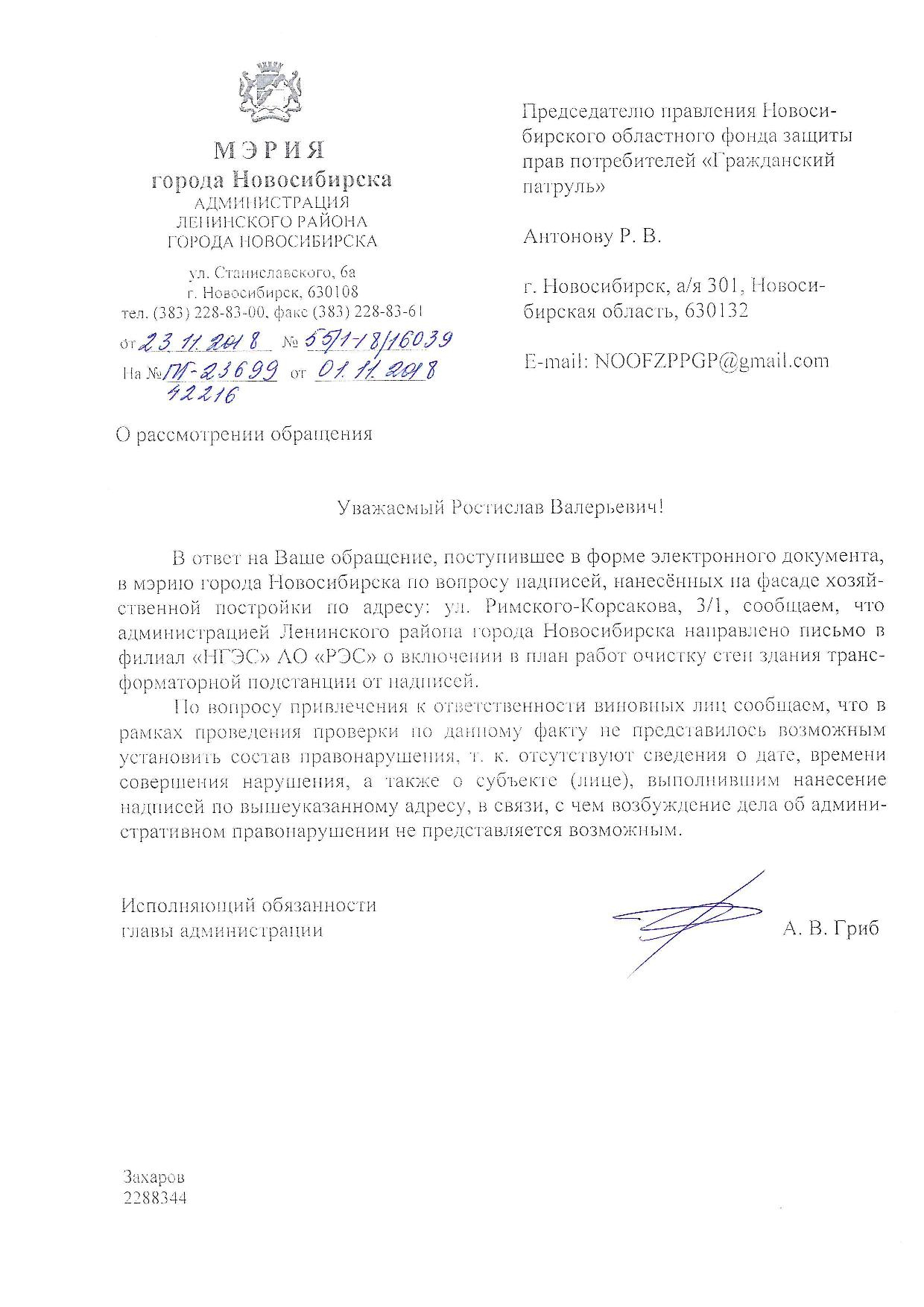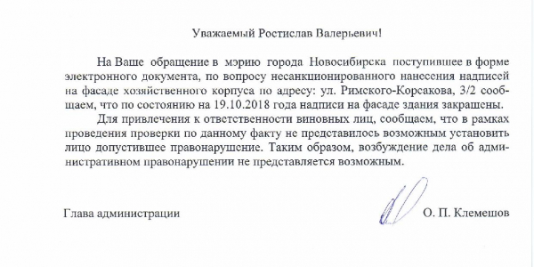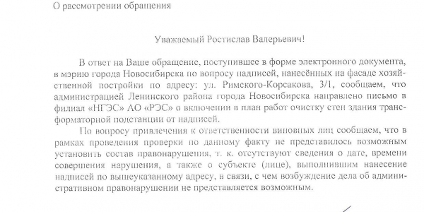 Номер жалобы:42216 Тип жалобы:Иные проблемы ЖКХ Название объекта:Управляющая Компания Регион:Новосибирская область Город:Новосибирск Адрес:ул. Римского-Корсакова, 3/1 Описание жалобы:Надписи на фасаде хозяйственного корпуса Статус: